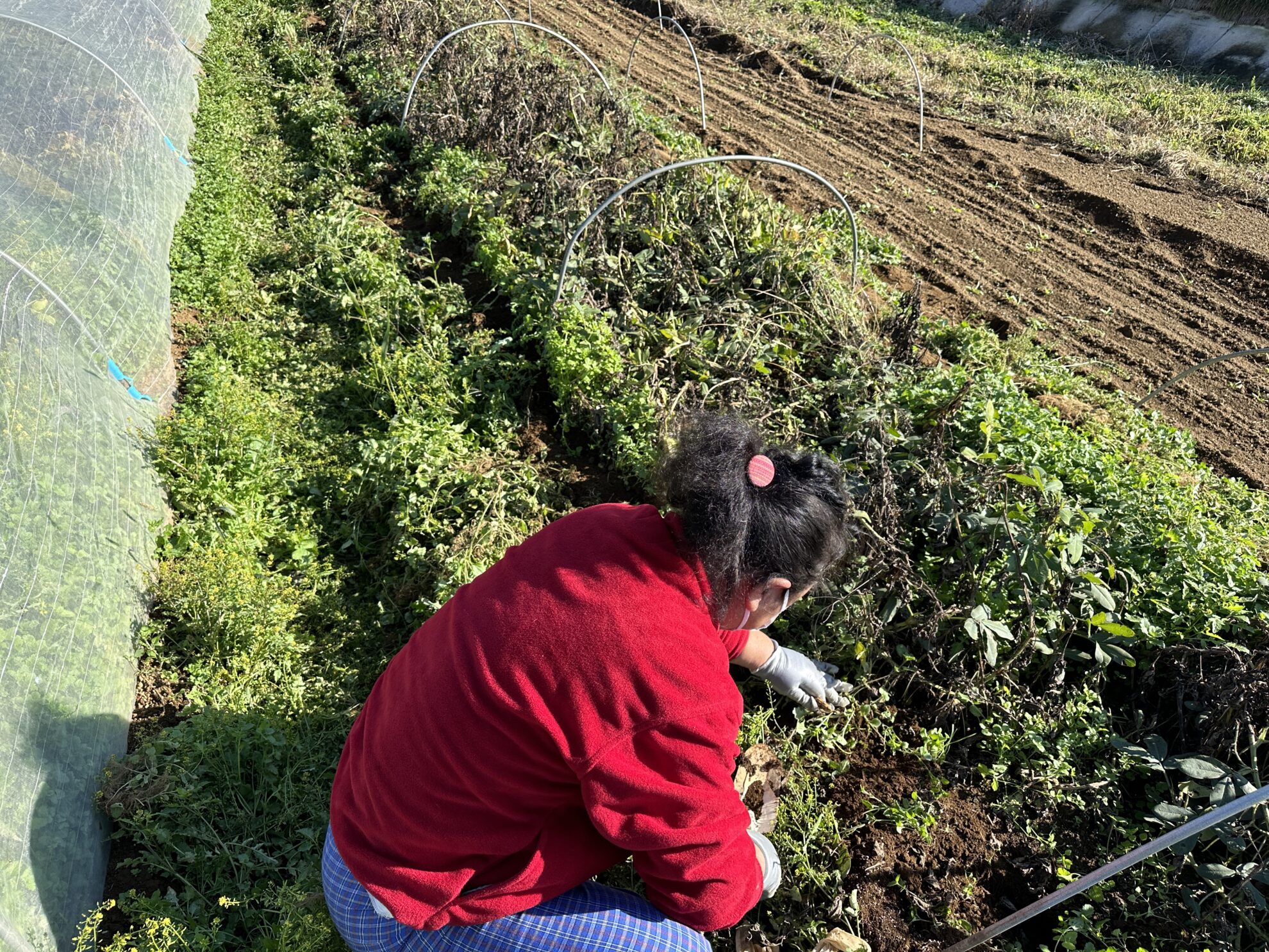 ※支柱や鳥よけ用の防虫ネット片付けや、収穫した黒落花生を斉藤さんのビニールハウス内に移動作業。