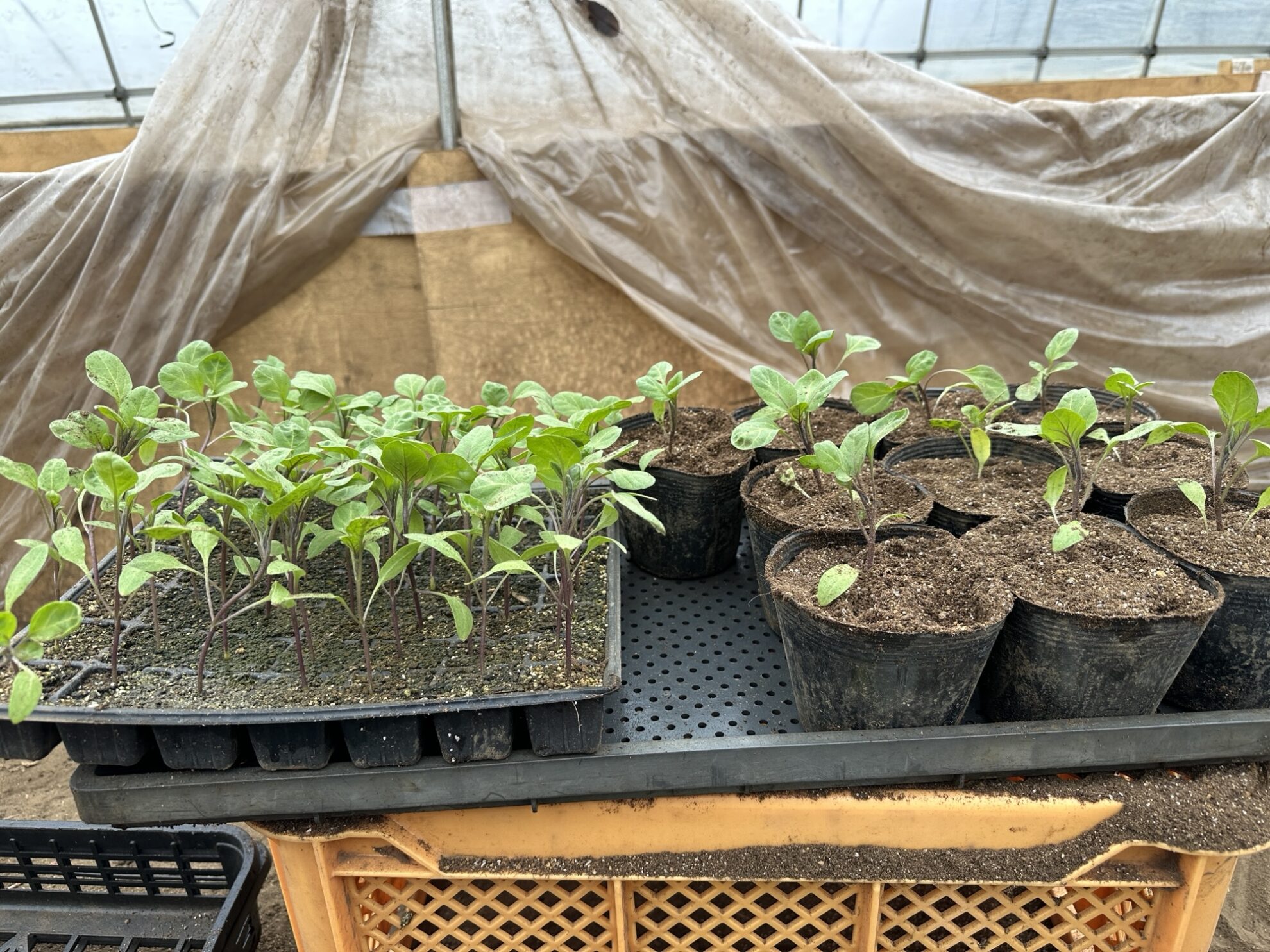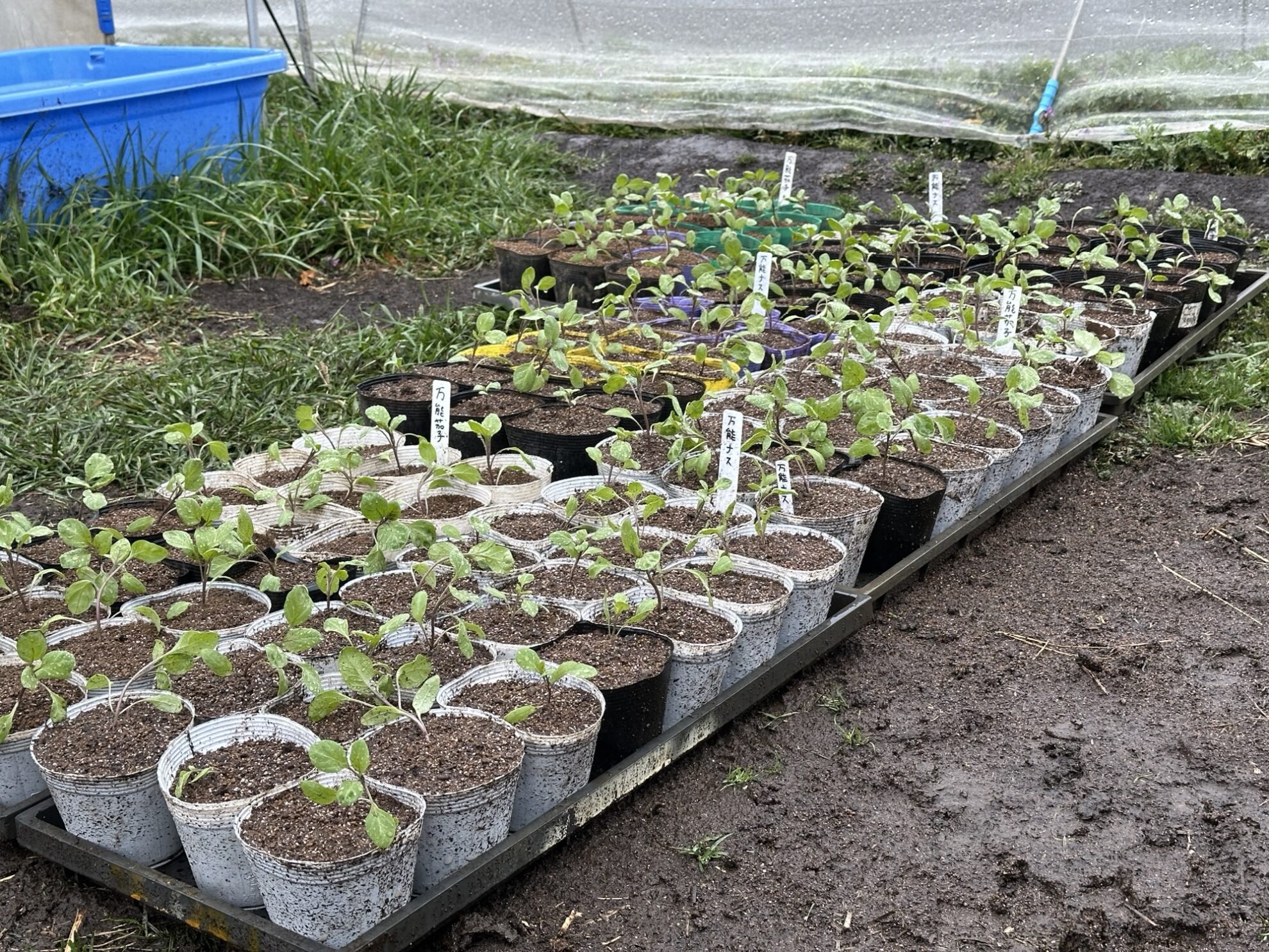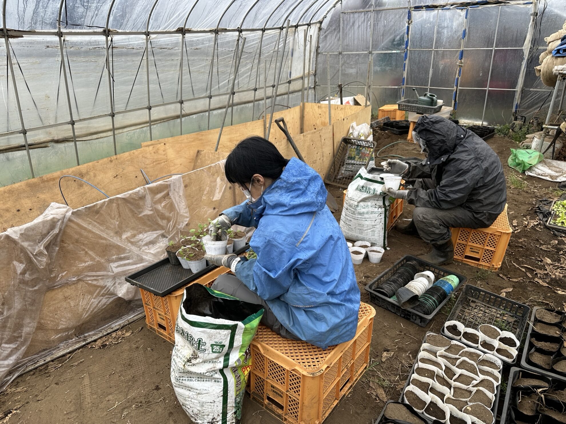 斉藤さん畑のビニールハウス内で、万能茄子の鉢上げ作業。