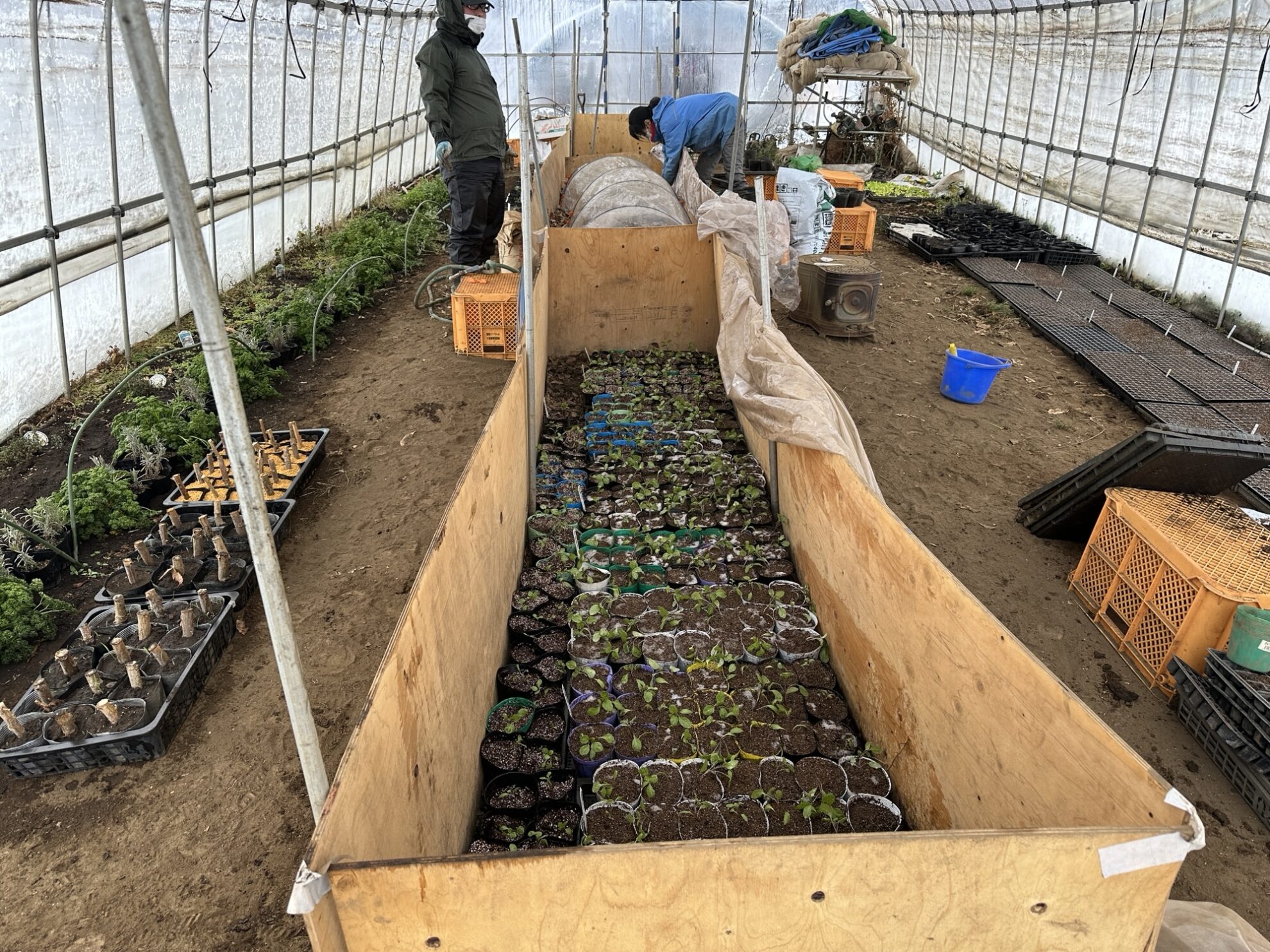 斉藤さん畑のビニールハウス内で、ハーブ類、リーキ、スナックエンドウの苗に水やり作業。