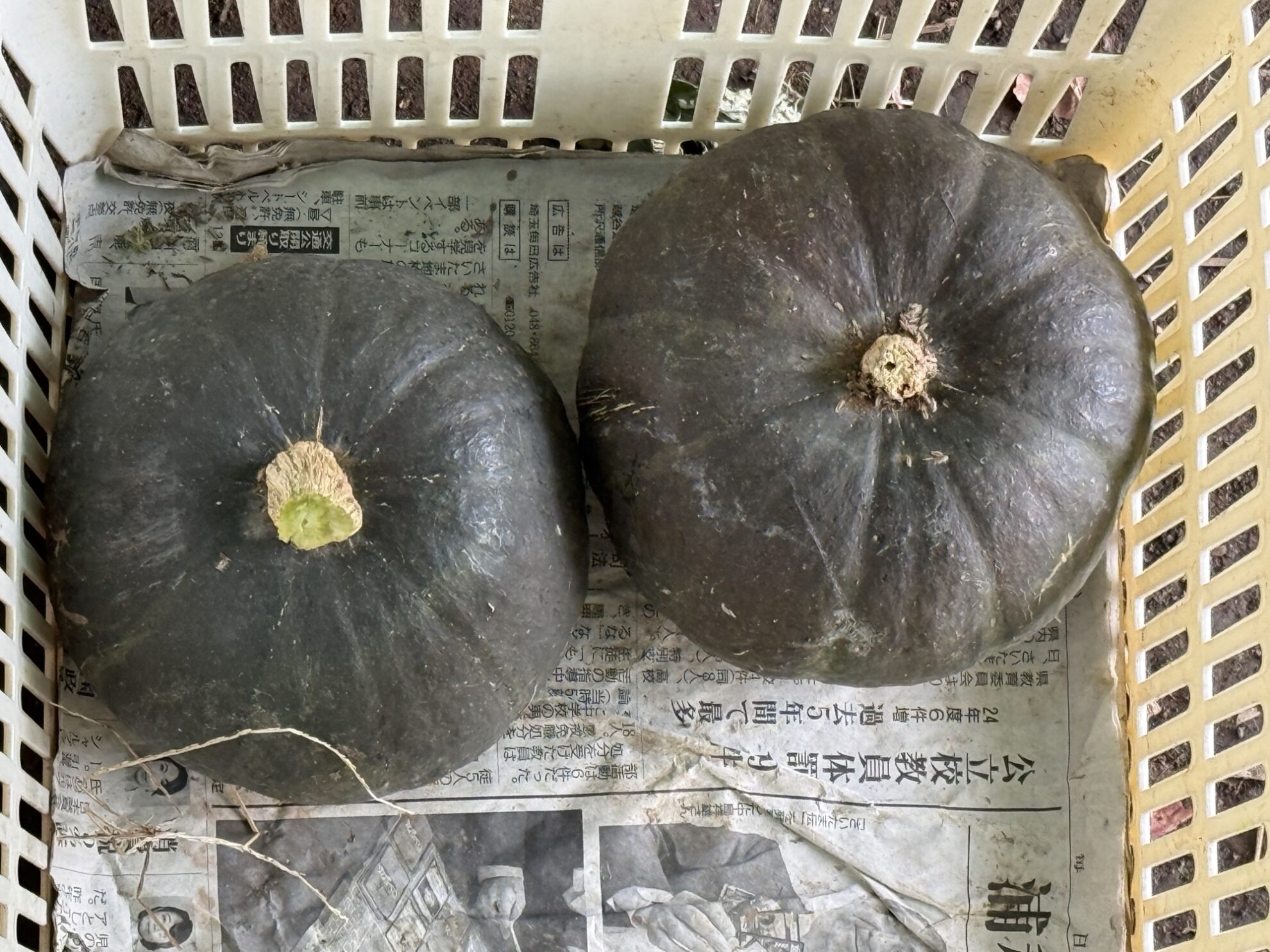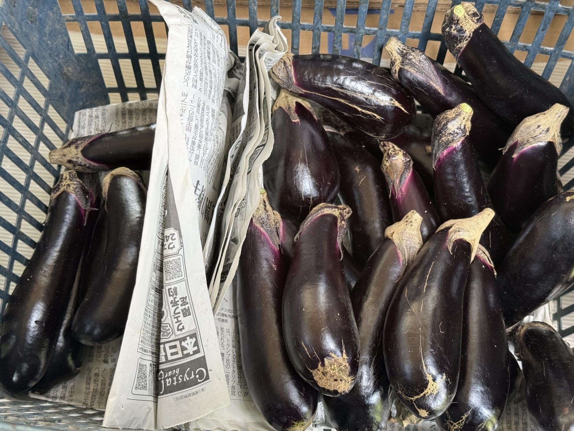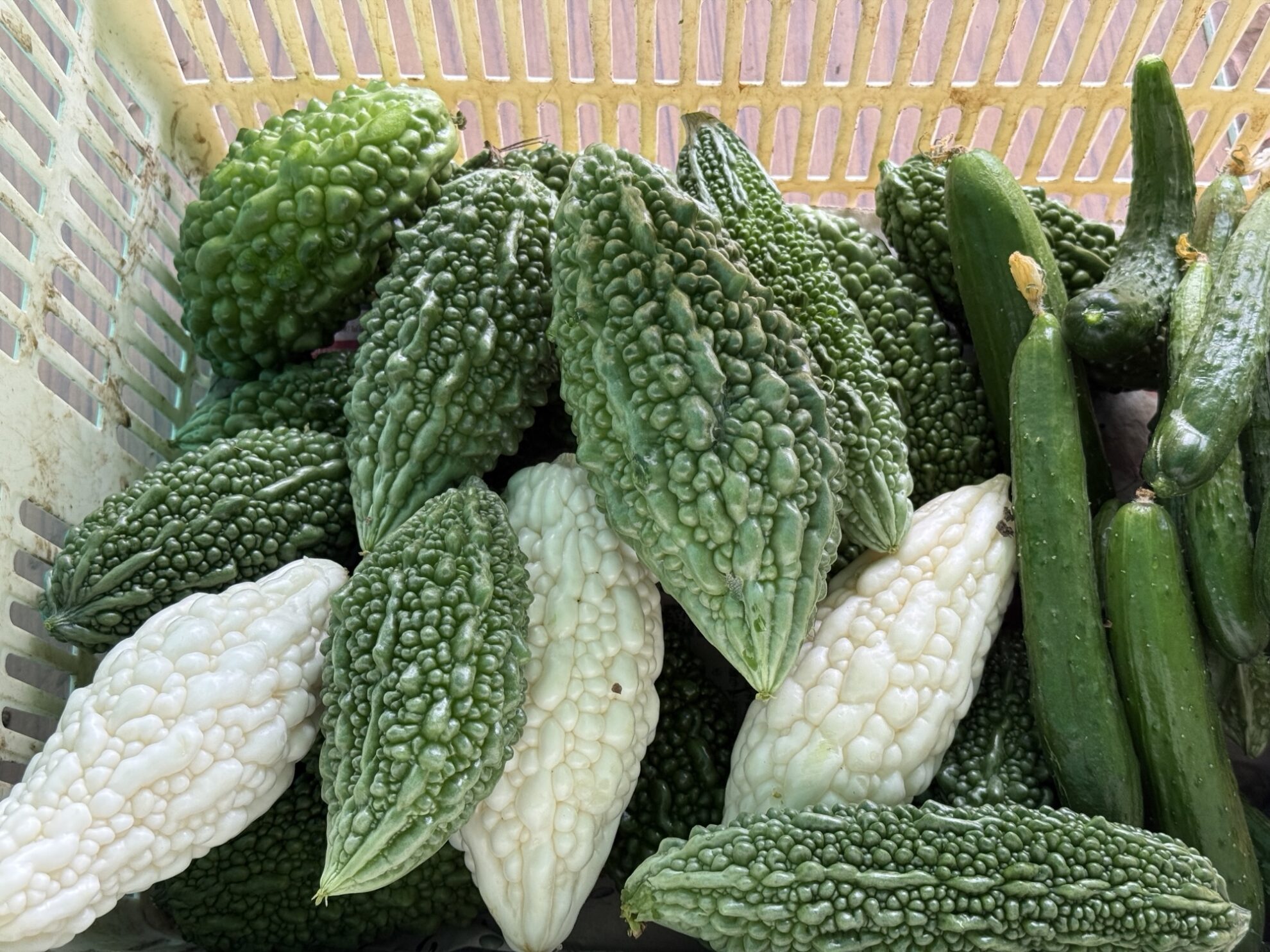 斉藤さんの下の畑で、万能茄子、長茄子、キュウリ、ゴーヤ(緑、白)の収穫作業。