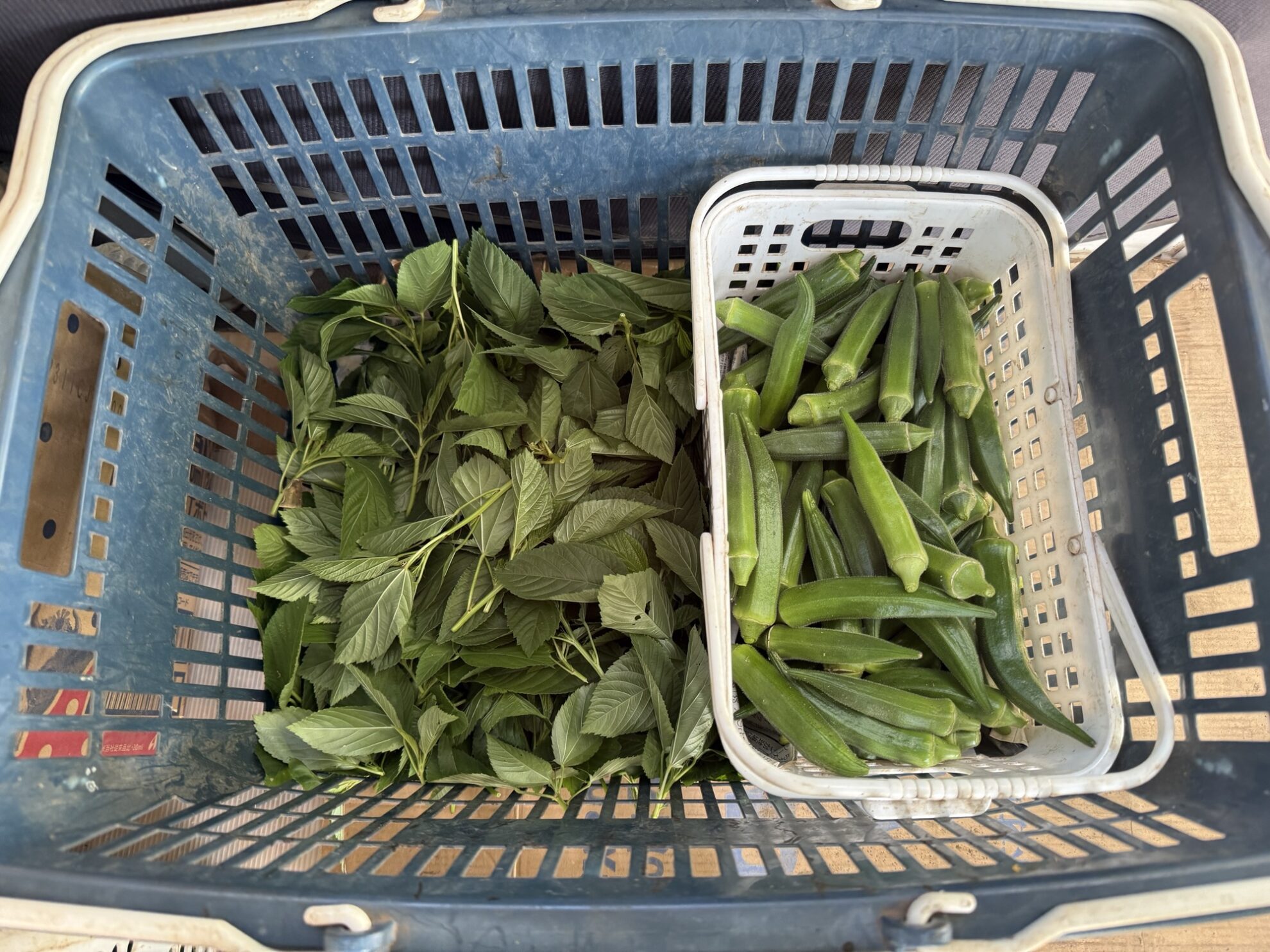 斉藤さんの上の畑で、ツルムラサキ、モロヘイヤ、オクラの収穫作業。