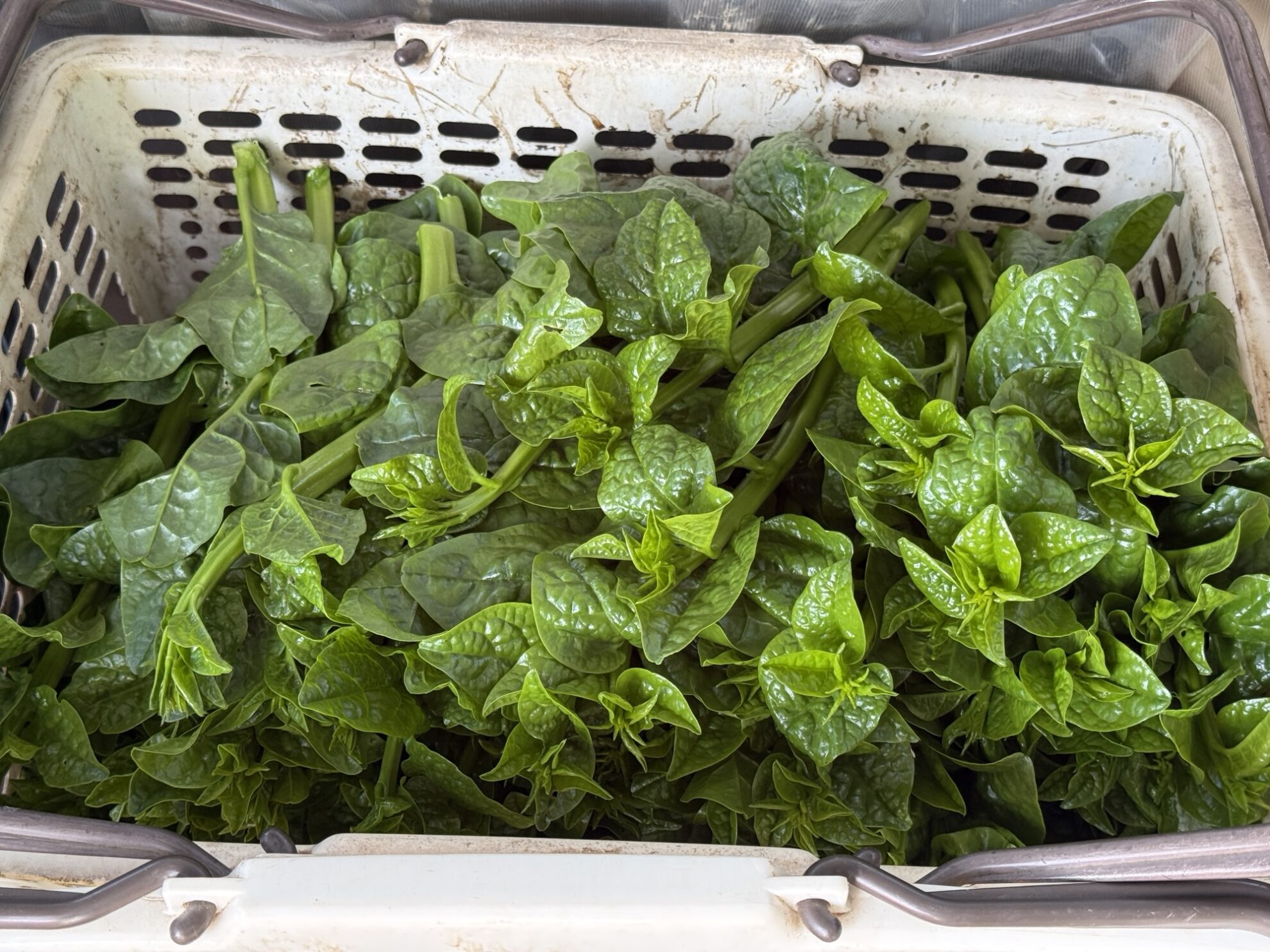 斉藤さんの最下段畑で、空芯菜の収穫作業。