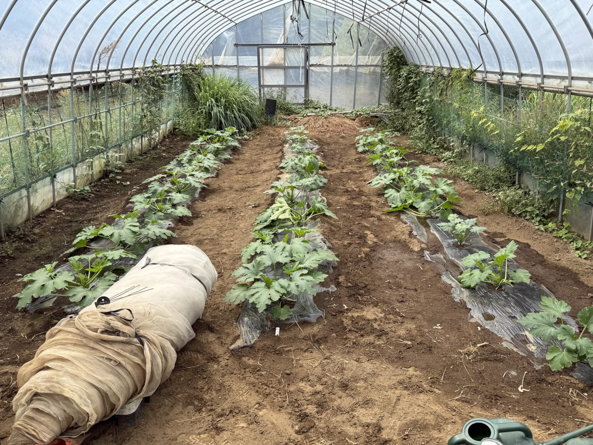 鈴木さん畑のビニールハウス内で、秋取りズッキーニの水やり作業。