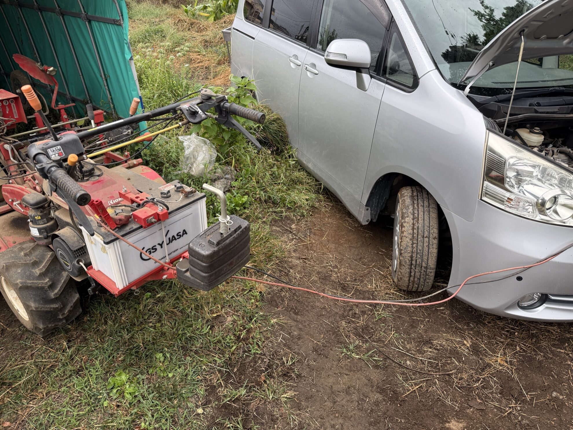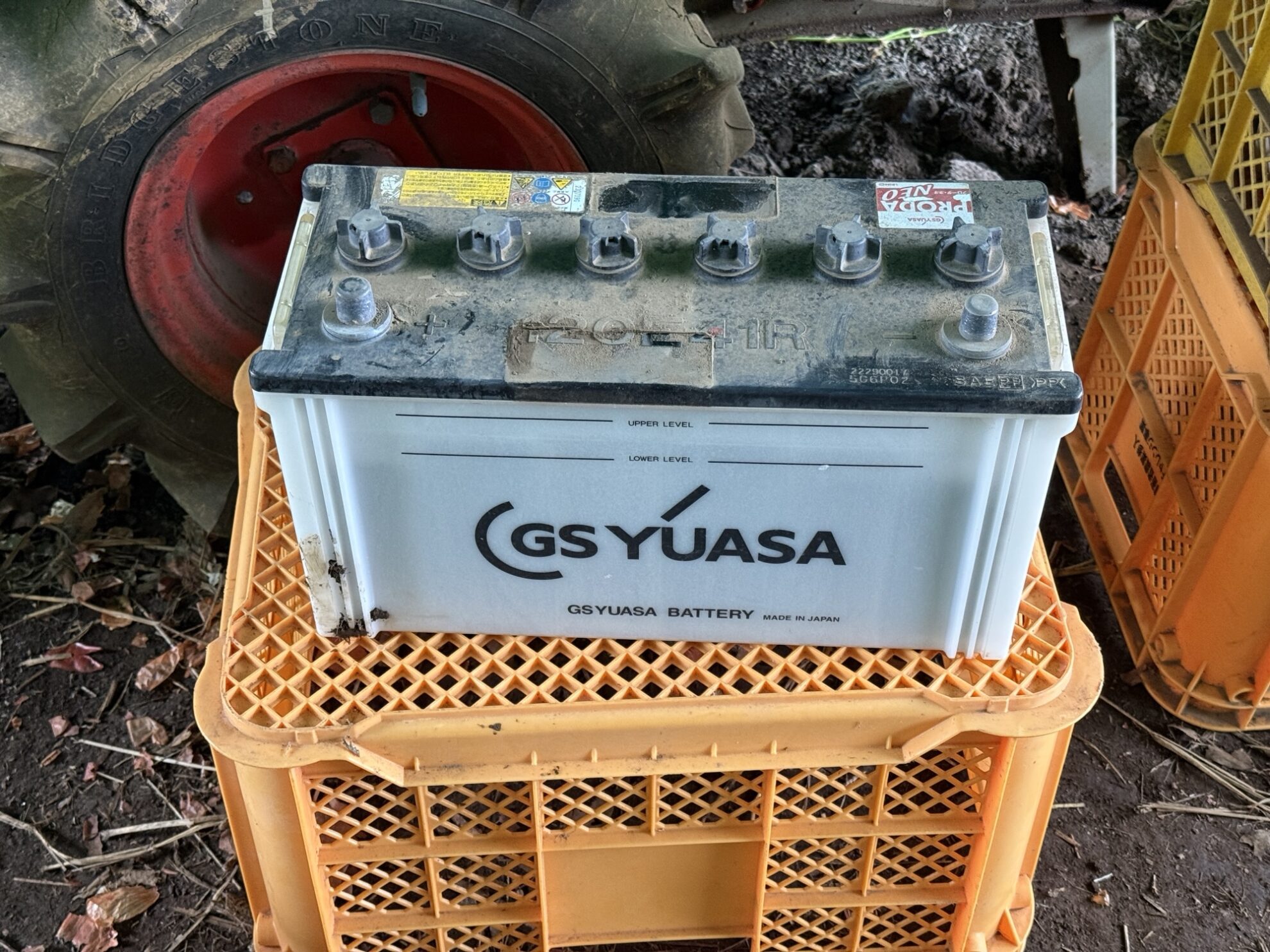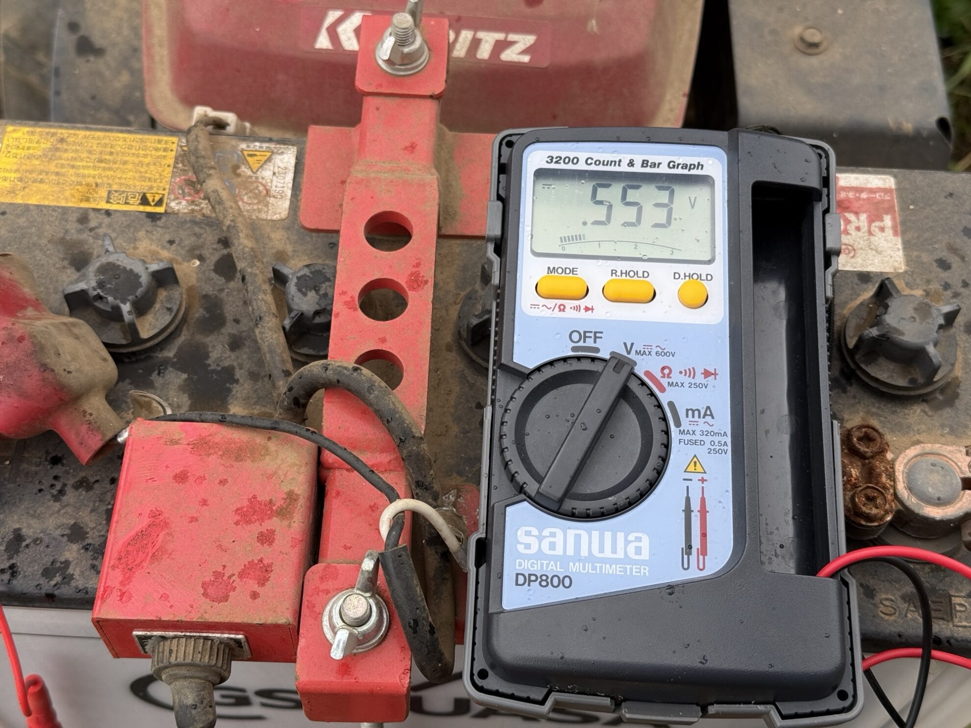 マルチシーダーのバッテリーは車からブースターケーブルを使用して30分位充電、その後マルチシーダーのエンジンを動かして30分程バッテリーを充電してみましたが、電圧を見ると0.5V程しか電圧が出ておらず、バッテリーは外して交換する事にしました。