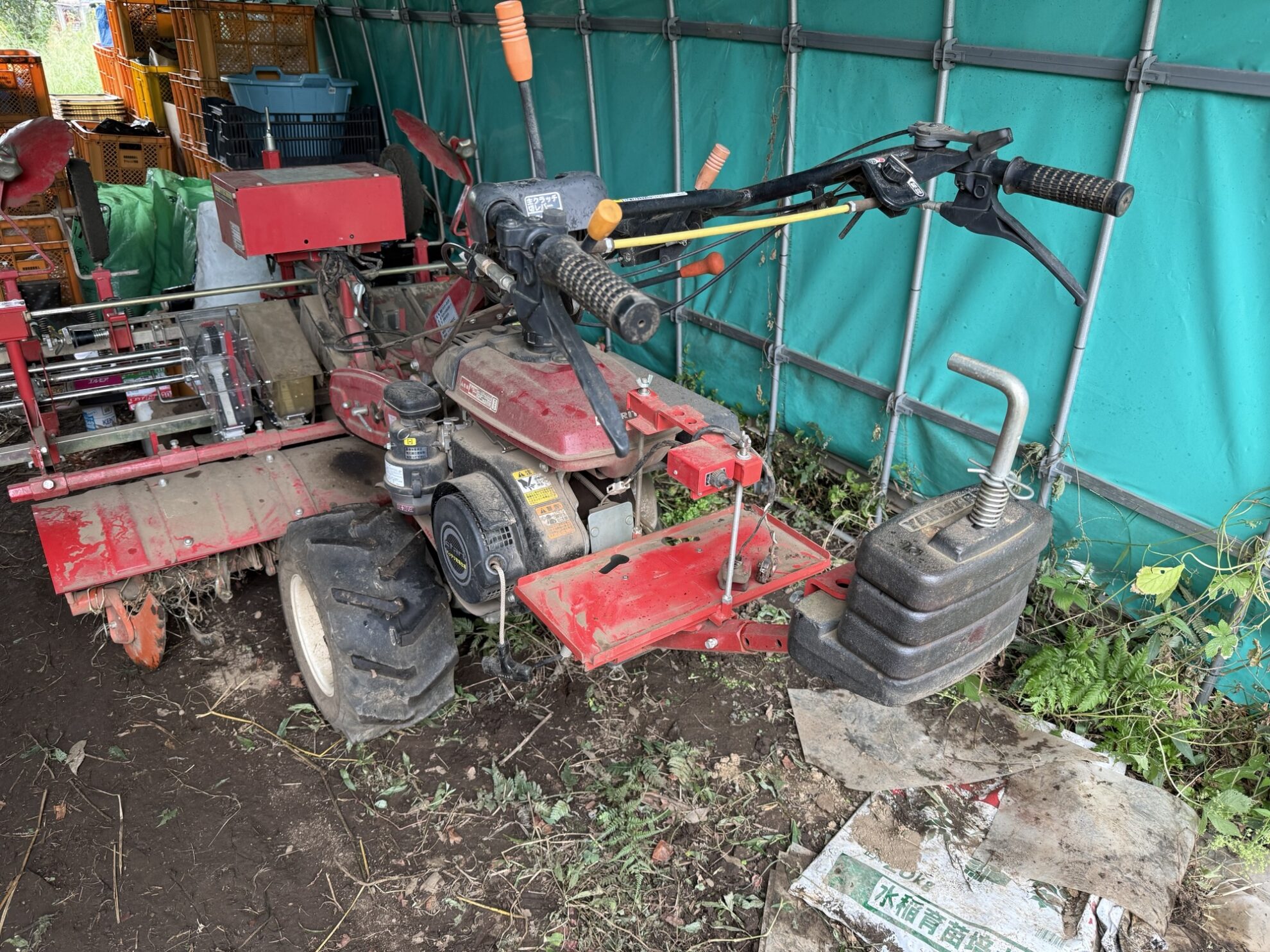 斉藤さんの下の畑の休憩所で、マルチシーダーのバッテリー外し作業、種まき部分の取り付け作業。
