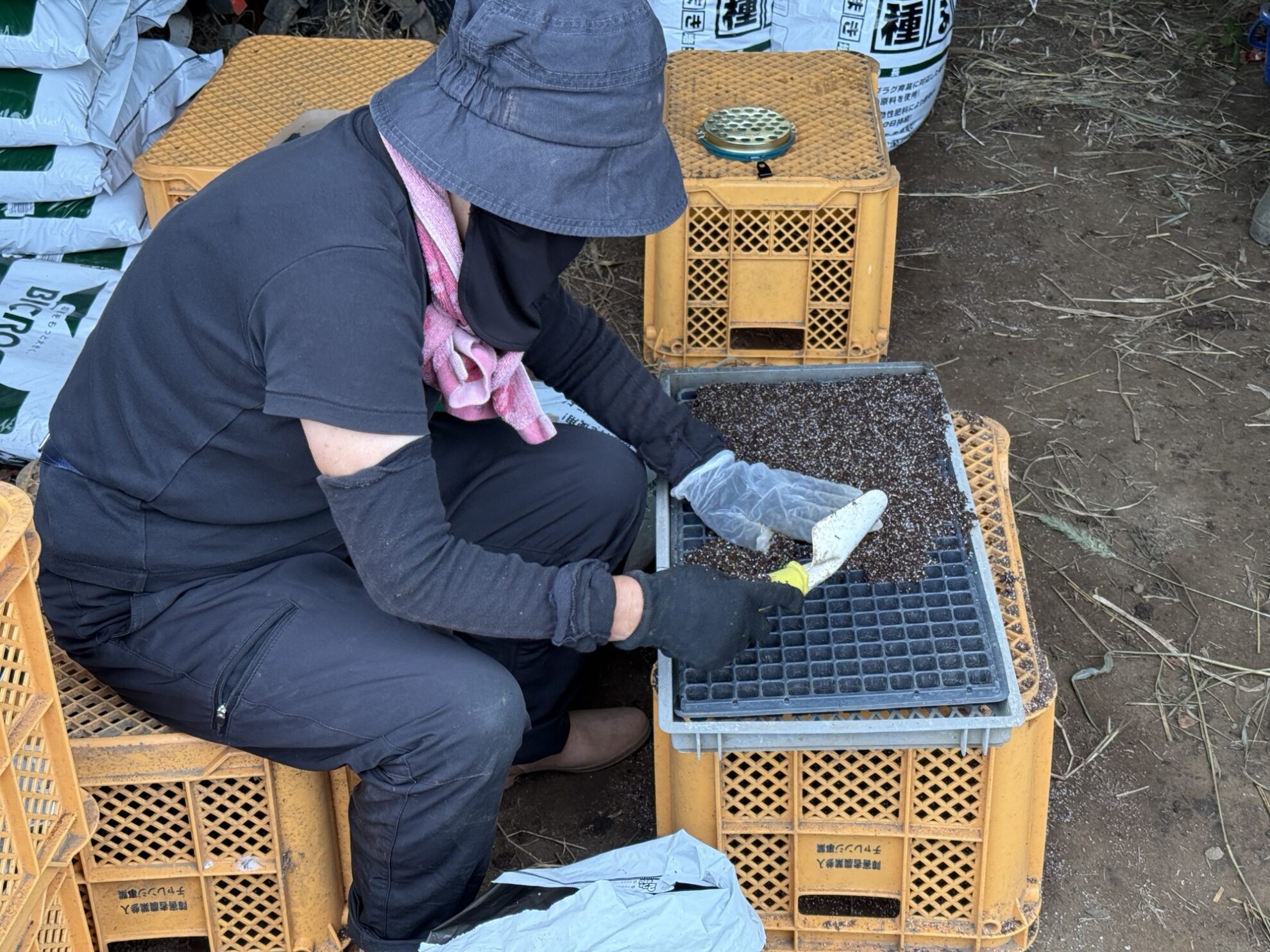 斉藤さんの上の畑の休憩所で、赤玉ねぎ(レッドアロー)、早生玉ねぎ(博多こがねEX)の播種作業。