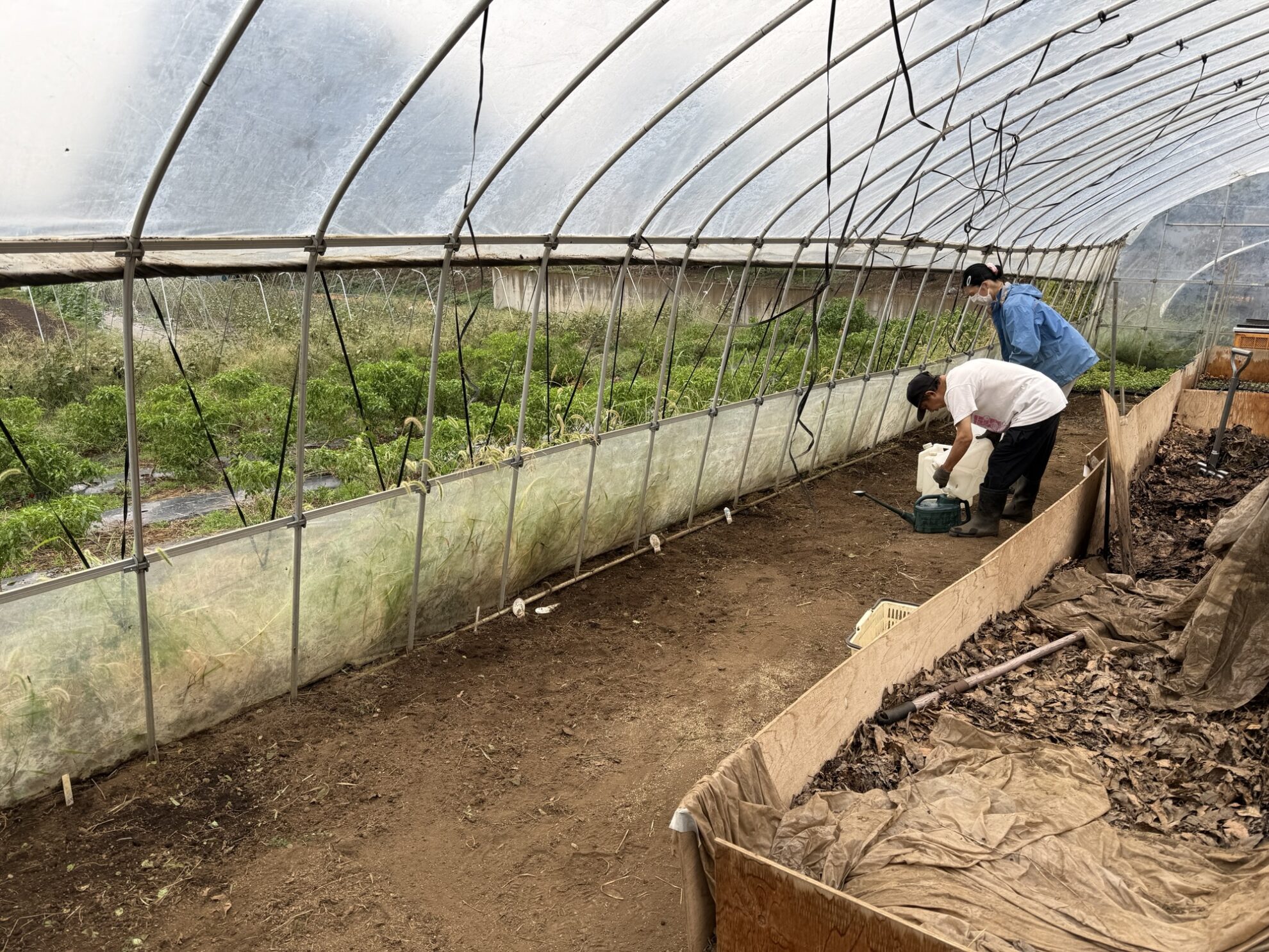 その後、種を蒔いたセルトレイを斉藤さん畑のビニールハウスに移動させて水やり作業。