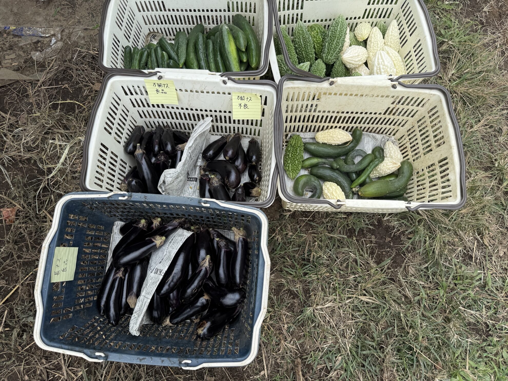 斉藤さんの下の畑で、長茄子、キュウリ、ゴーヤ(緑、白)の収穫作業。