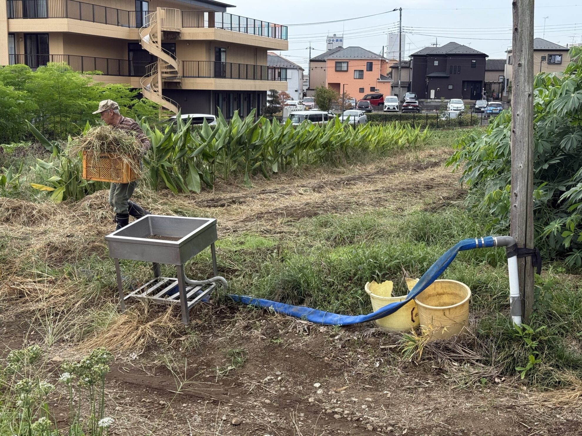 斉藤さんの最下段畑で、空芯菜の収穫作業。