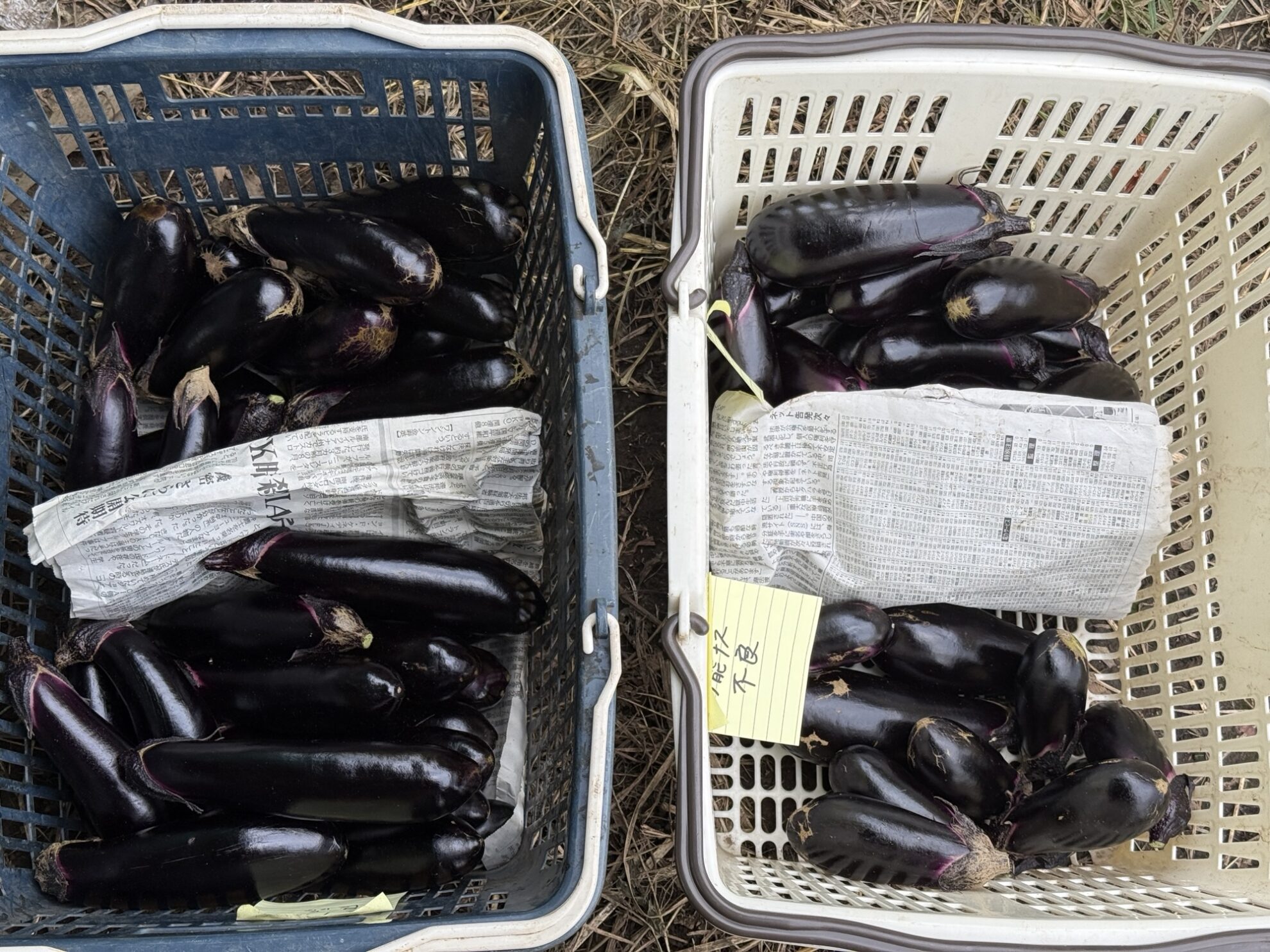 斉藤さんの中の畑で、万能茄子の収穫作業。