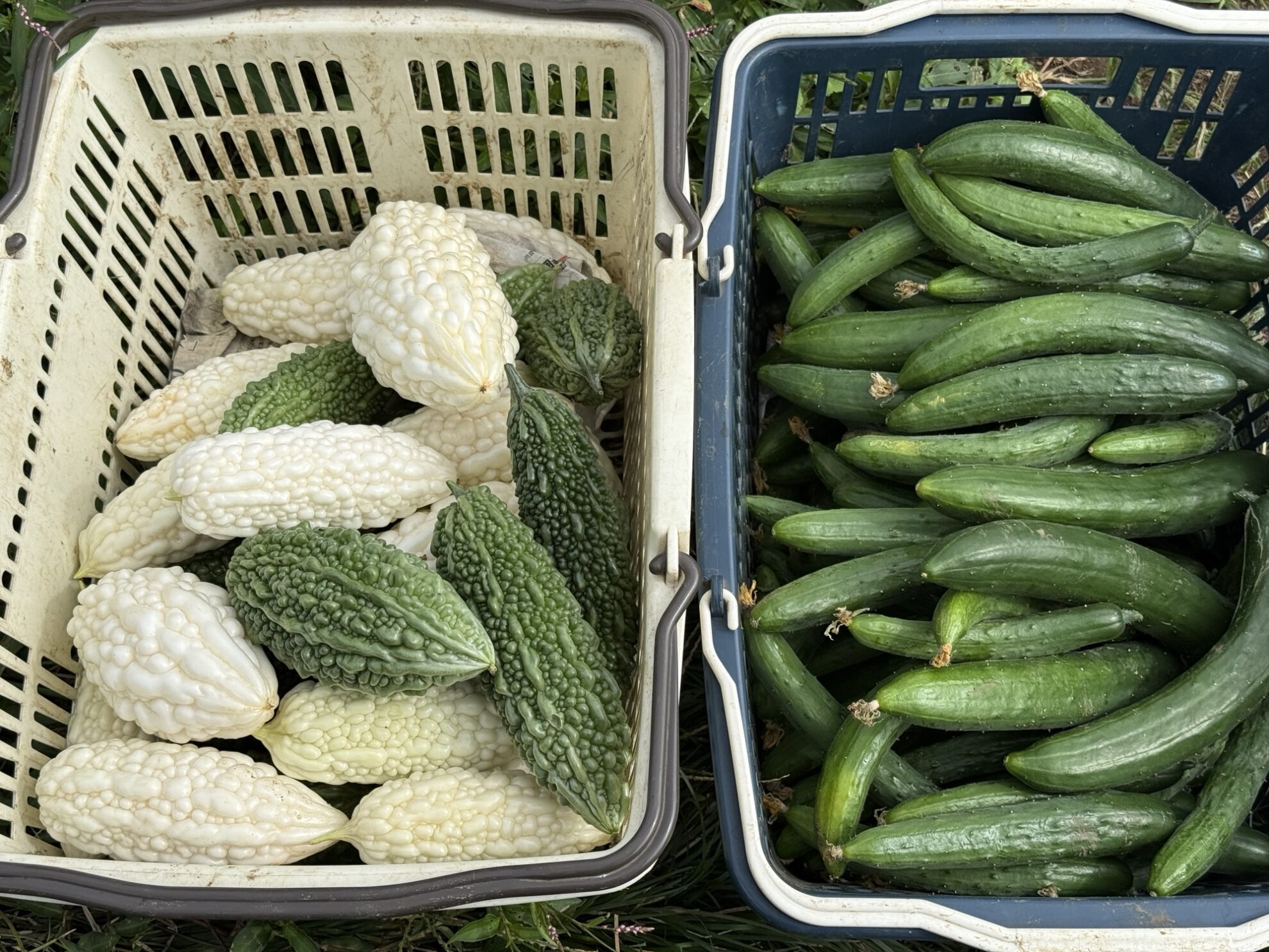 斉藤さんの下の畑で、長茄子、キュウリ、ゴーヤ(緑、白)の収穫作業。