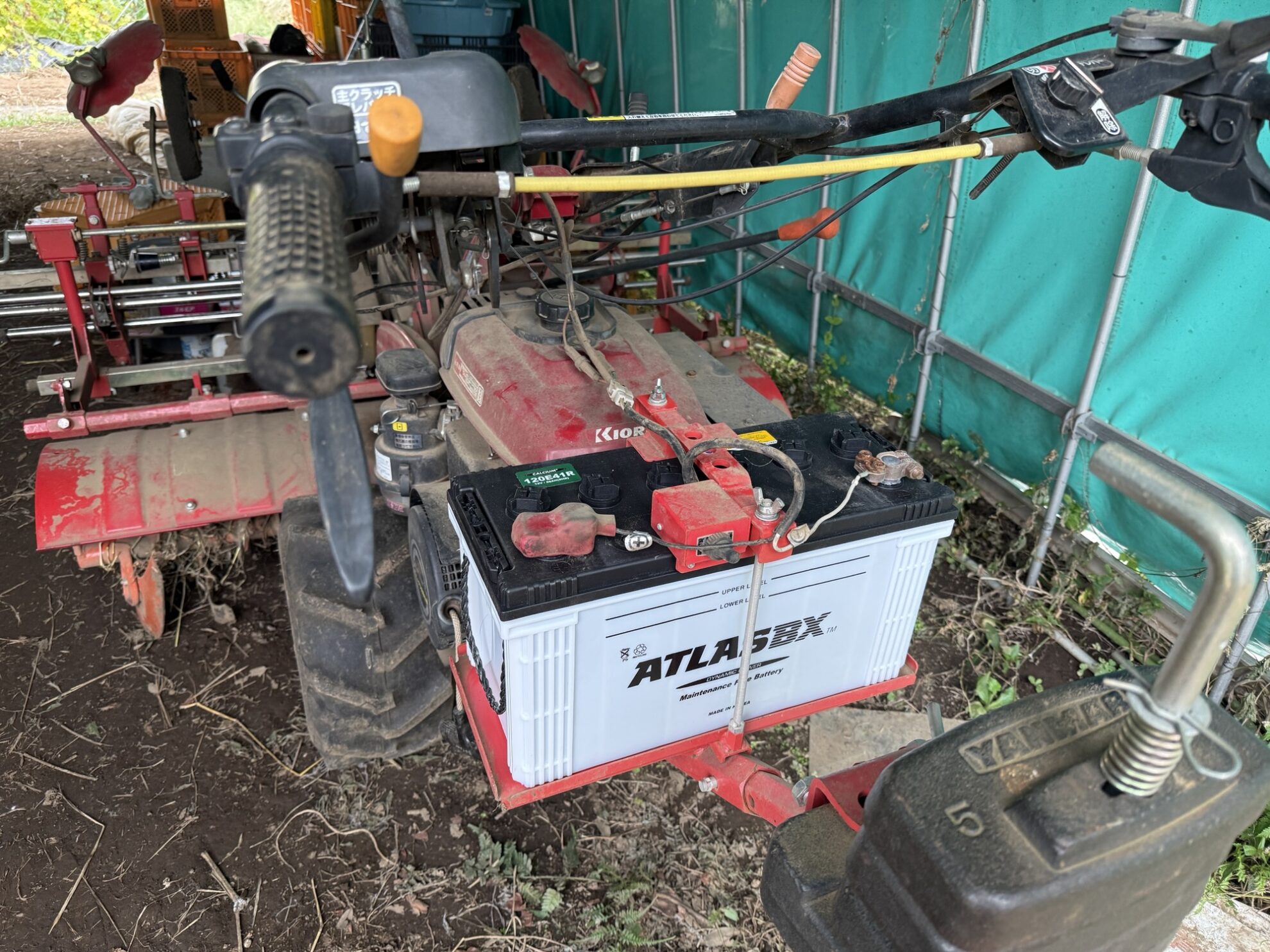 斉藤さんの下の畑の休憩所で、マルチシーダーに新しいバッテリーの取り付け作業と、センサーの動作チェック作業。