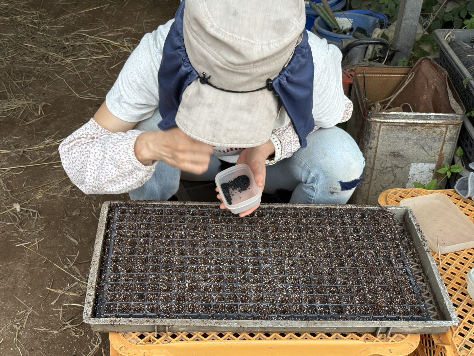 斉藤さんの上の畑の休憩所で、玉ねぎ(甘70)の播種作業。