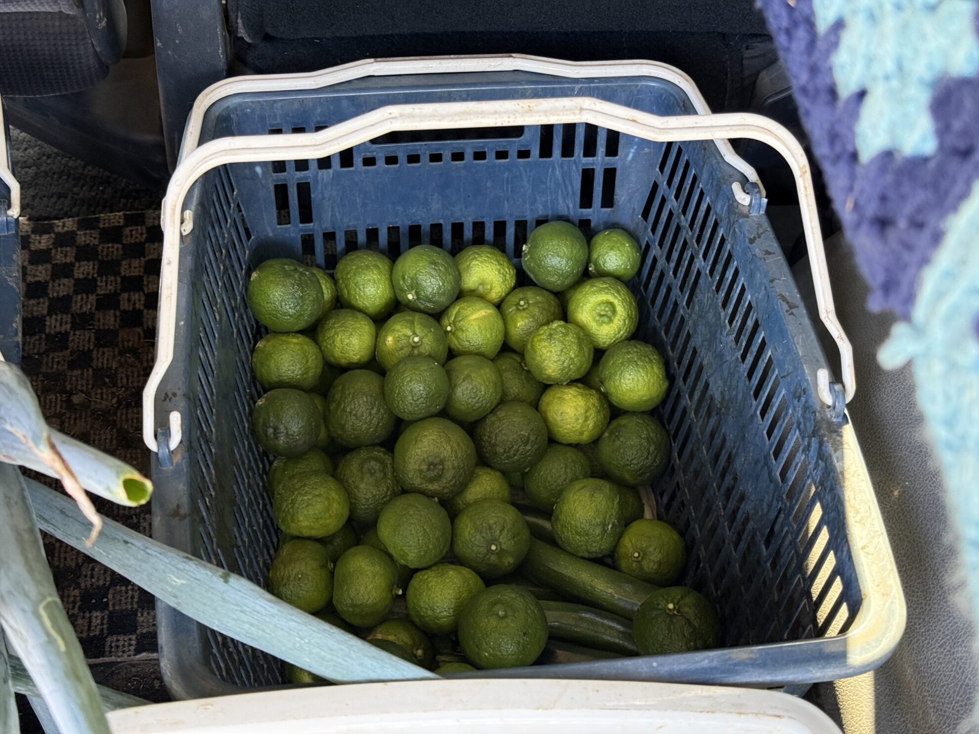 斉藤さんの上の畑で、ツルムラサキ、モロヘイヤ、オクラの収穫作業。