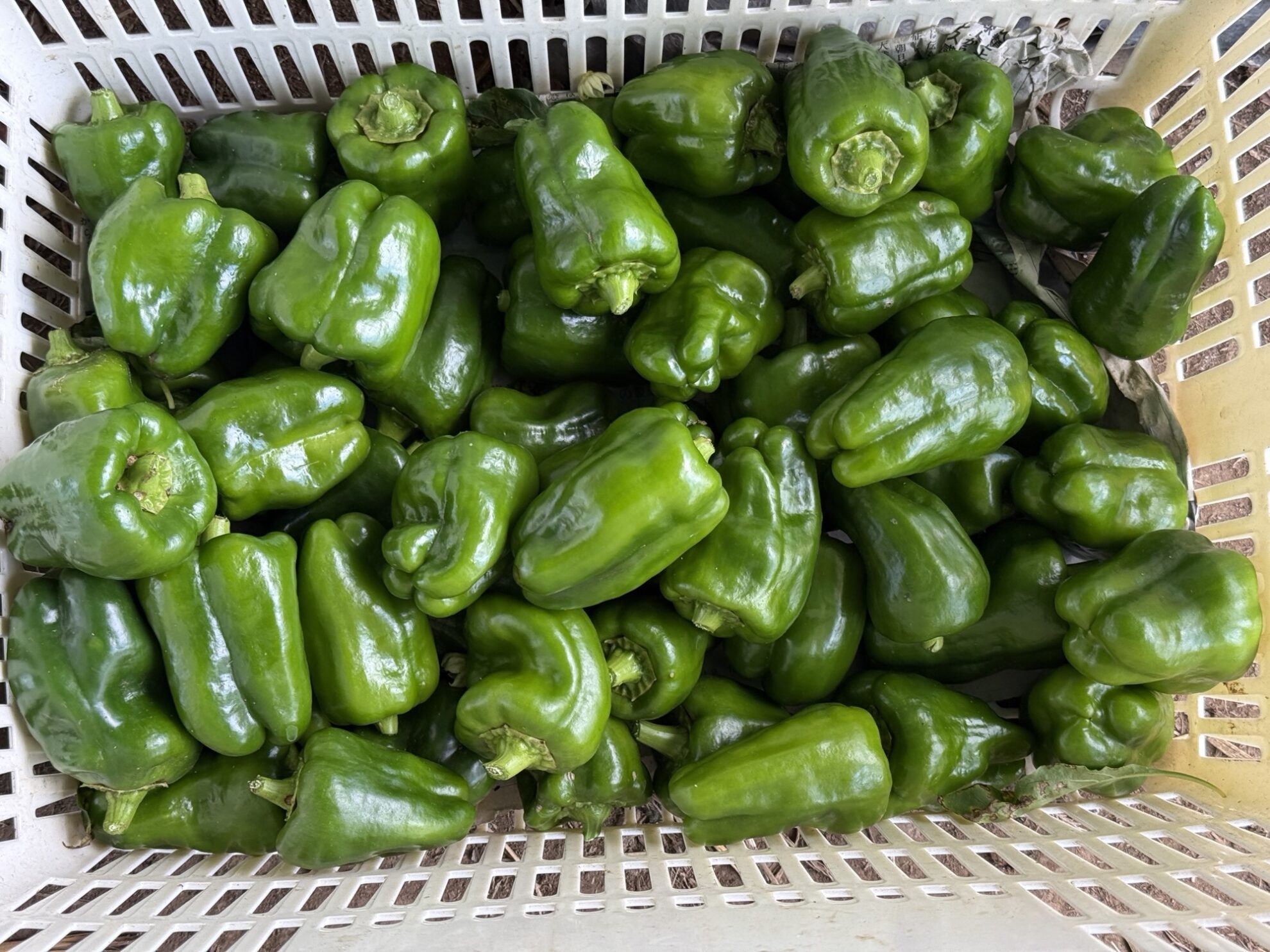 斉藤さんの中の畑で、ピーマンの収穫作業。