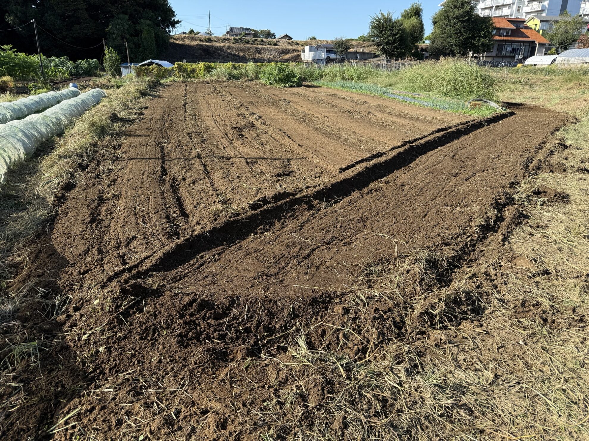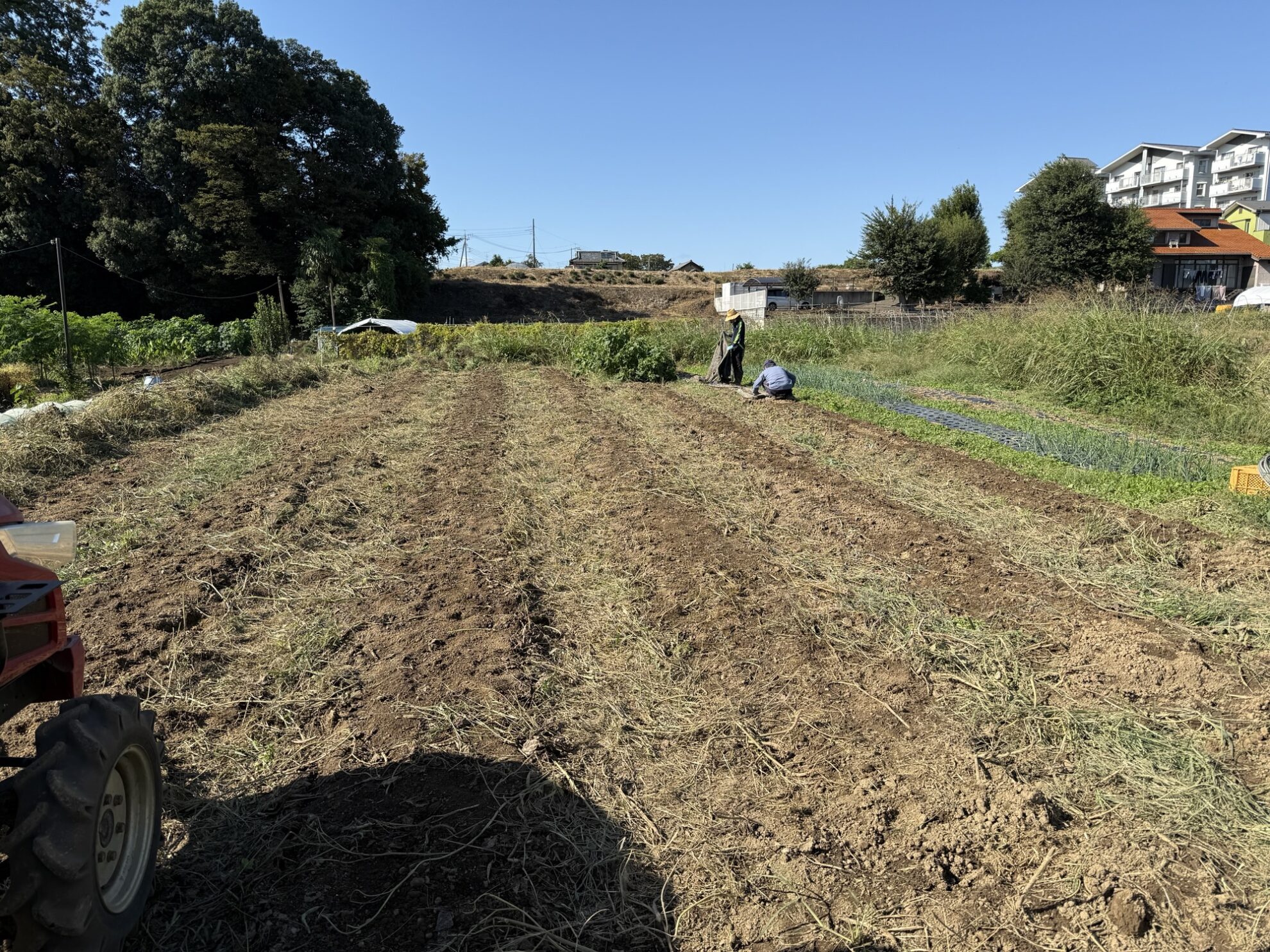吉岡さん畑で、マルチの片付け後に山部分をトラクターで耕耘作業。
