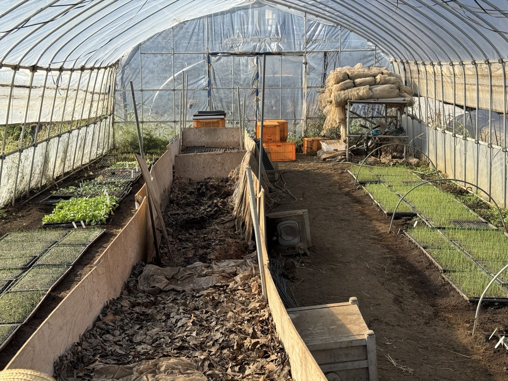 斉藤さん畑のビニールハウス内で、玉ねぎ苗、白菜苗、赤キャベツ苗に水やり作業。