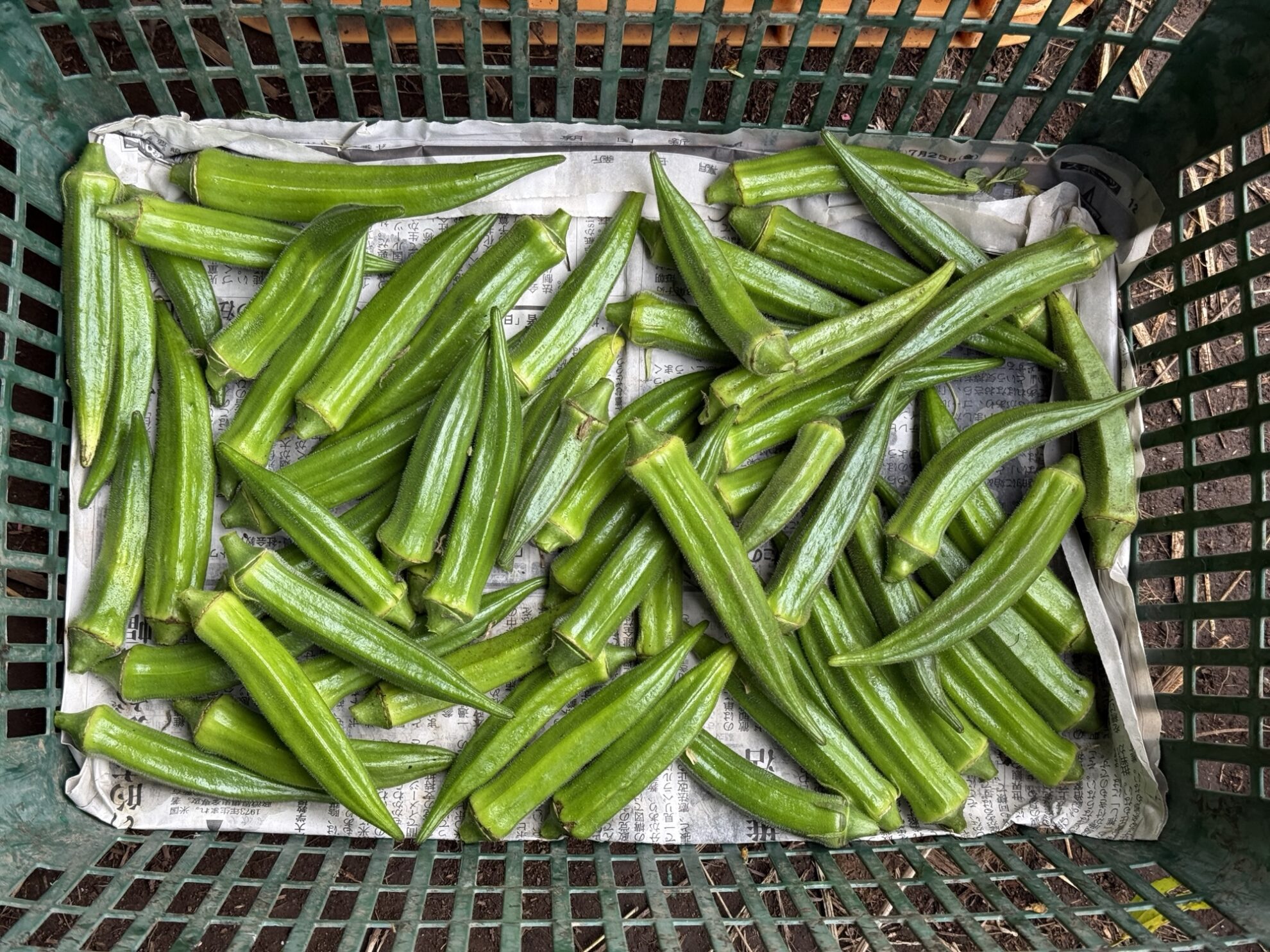 斉藤さんの上の畑で、ツルムラサキ、モロヘイヤ、オクラの収穫作業。