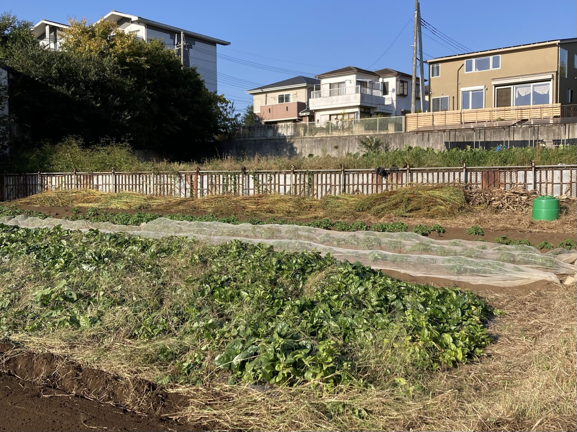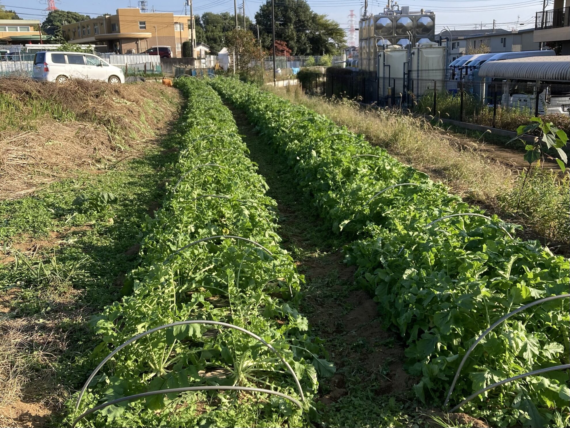 2025年10月30日(木)の作業記録 (青首大根の追肥作業、ジャガイモに寒さ対策用のネット張り作業、モロヘイヤとさつま芋の跡地に鶏糞を撒きトラクターで耕耘作業、チンゲンサイの播種作業、枝豆跡地のマルチ剥がし作業)