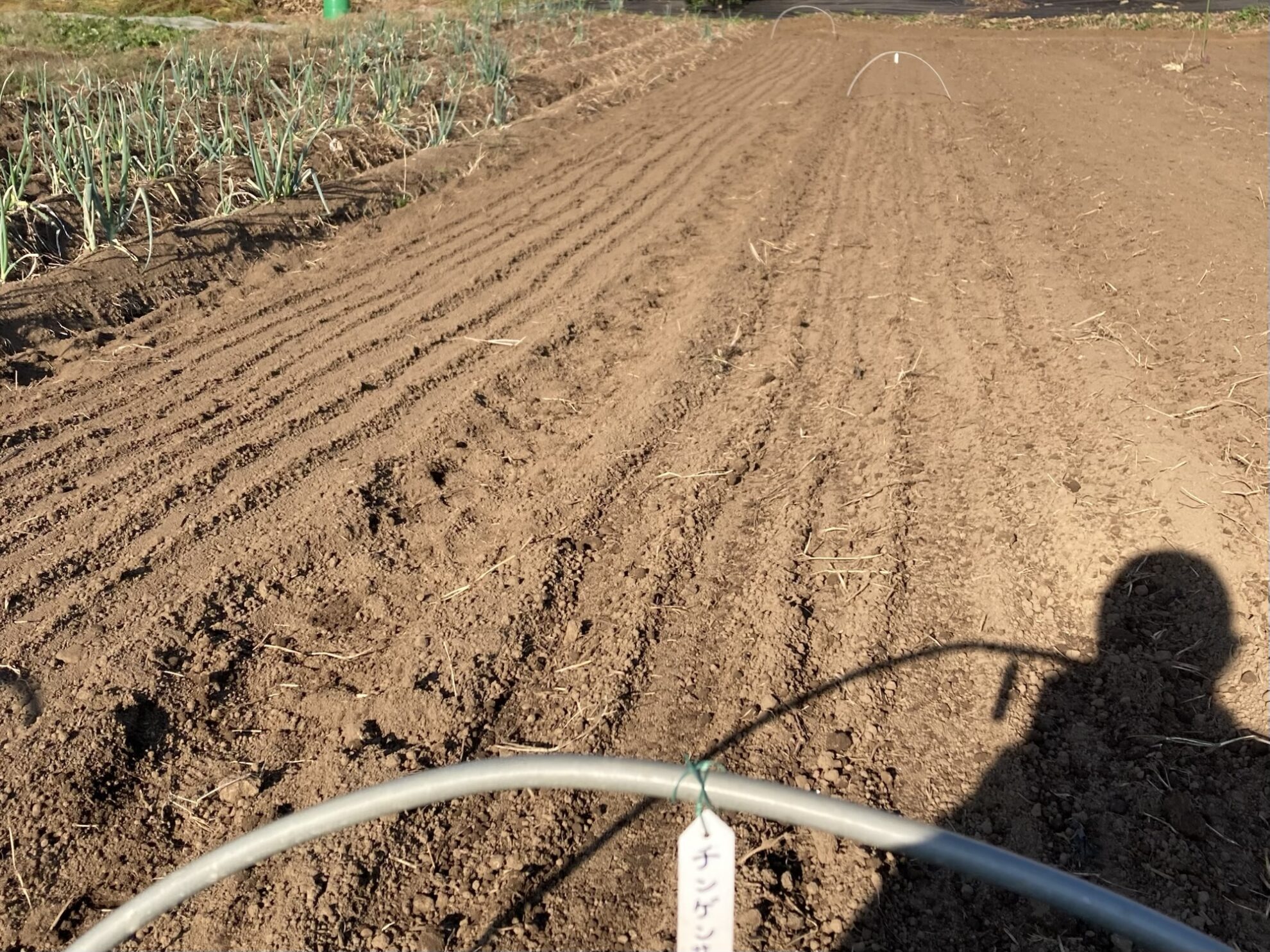 田中さん畑で、チンゲサイの播種作業。