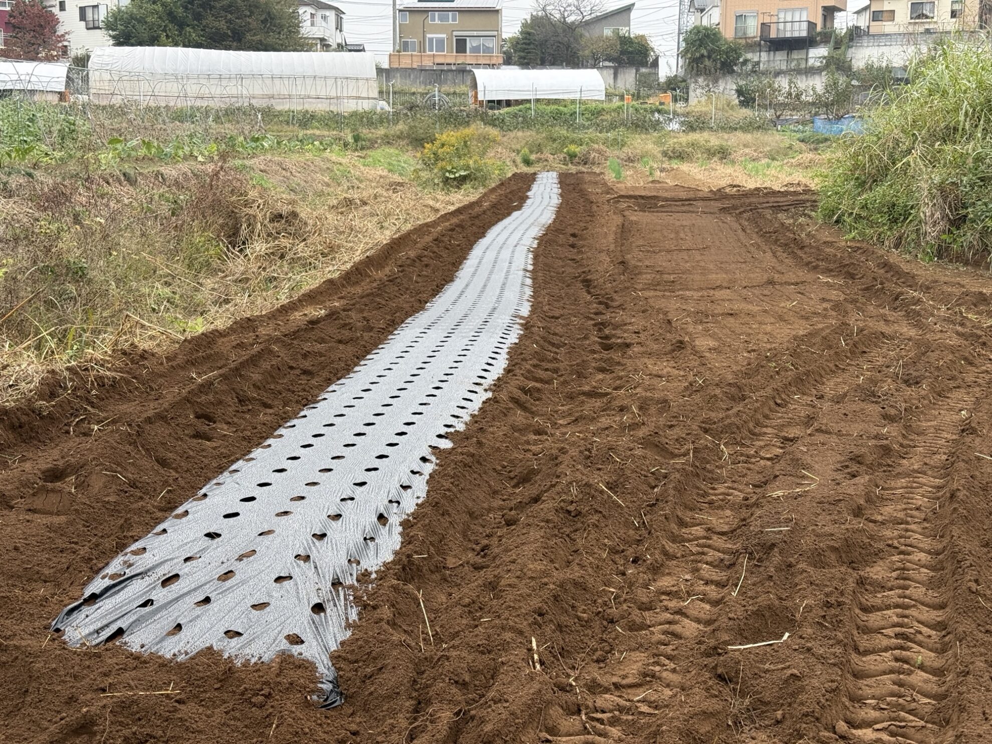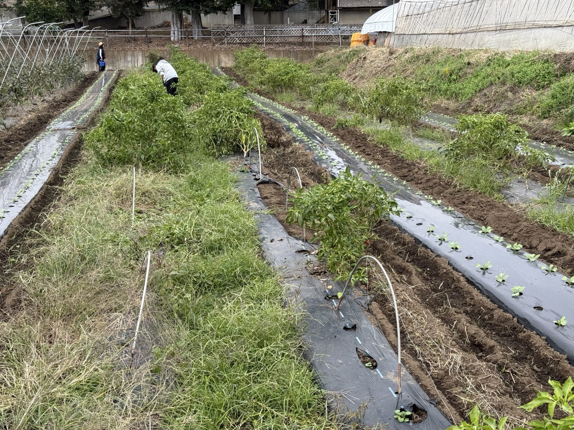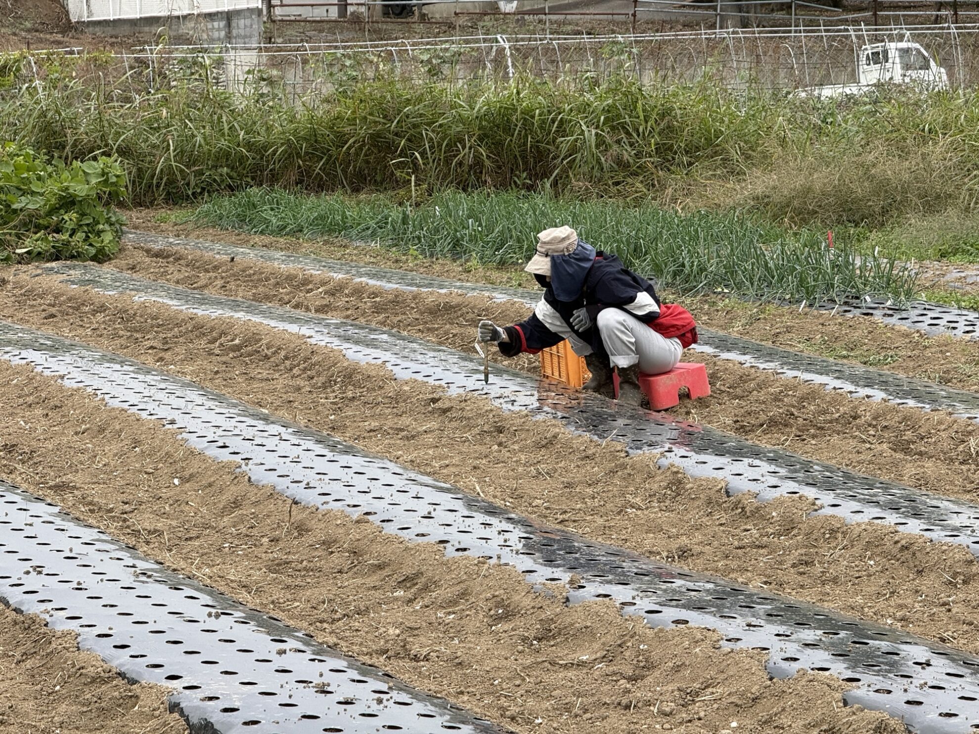 2025年10月31日(金)の作業記録 (斉藤さんの上の畑に大根用のマルチ張り作業、青首大根・強力大根の播種作業、吉岡さん畑の山部分で嘉定ニンニク・分葱の定植作業、ピーマンとモロヘイヤの撤去作業、吉岡さん畑でほうれん草の播種作業)