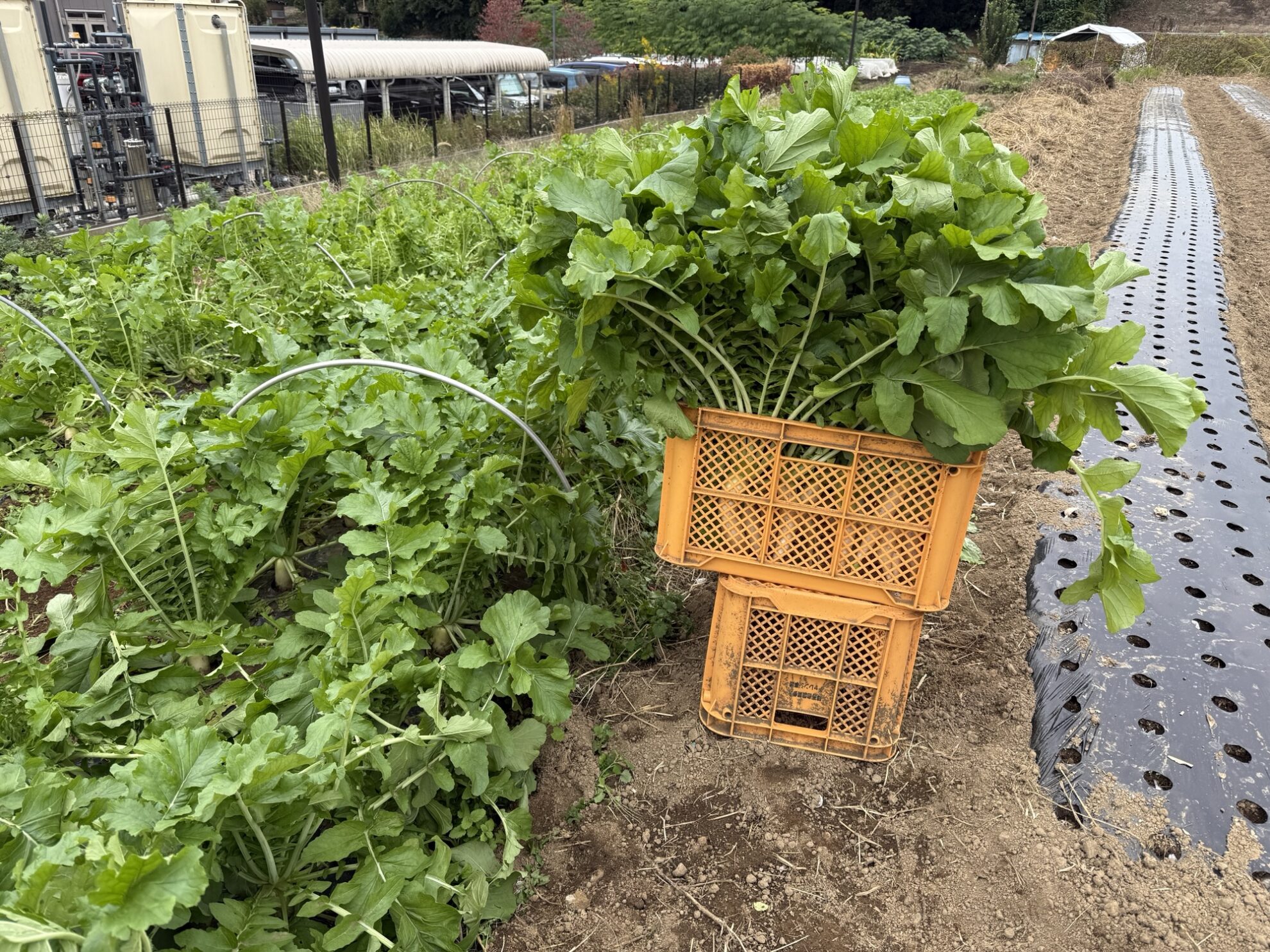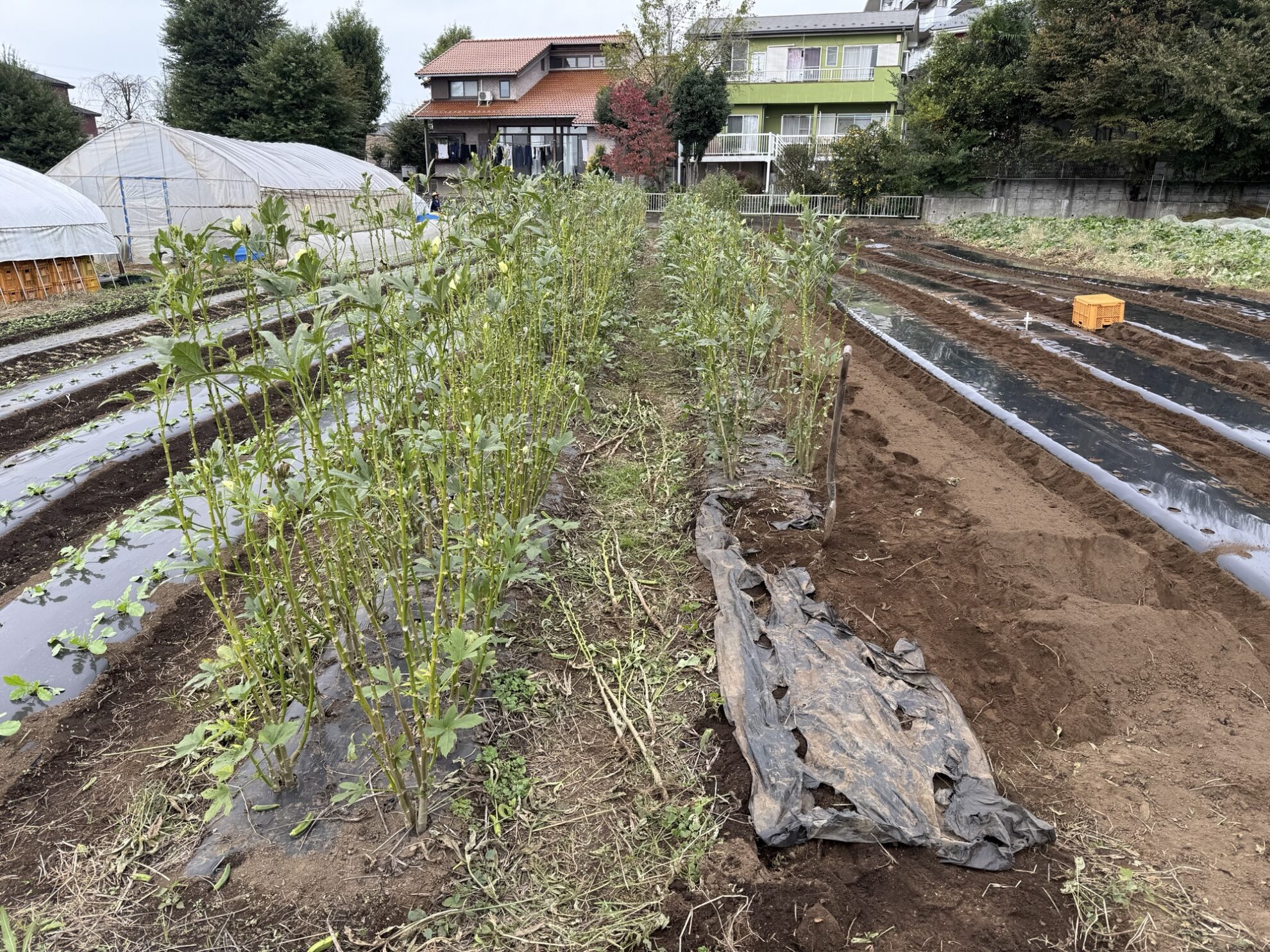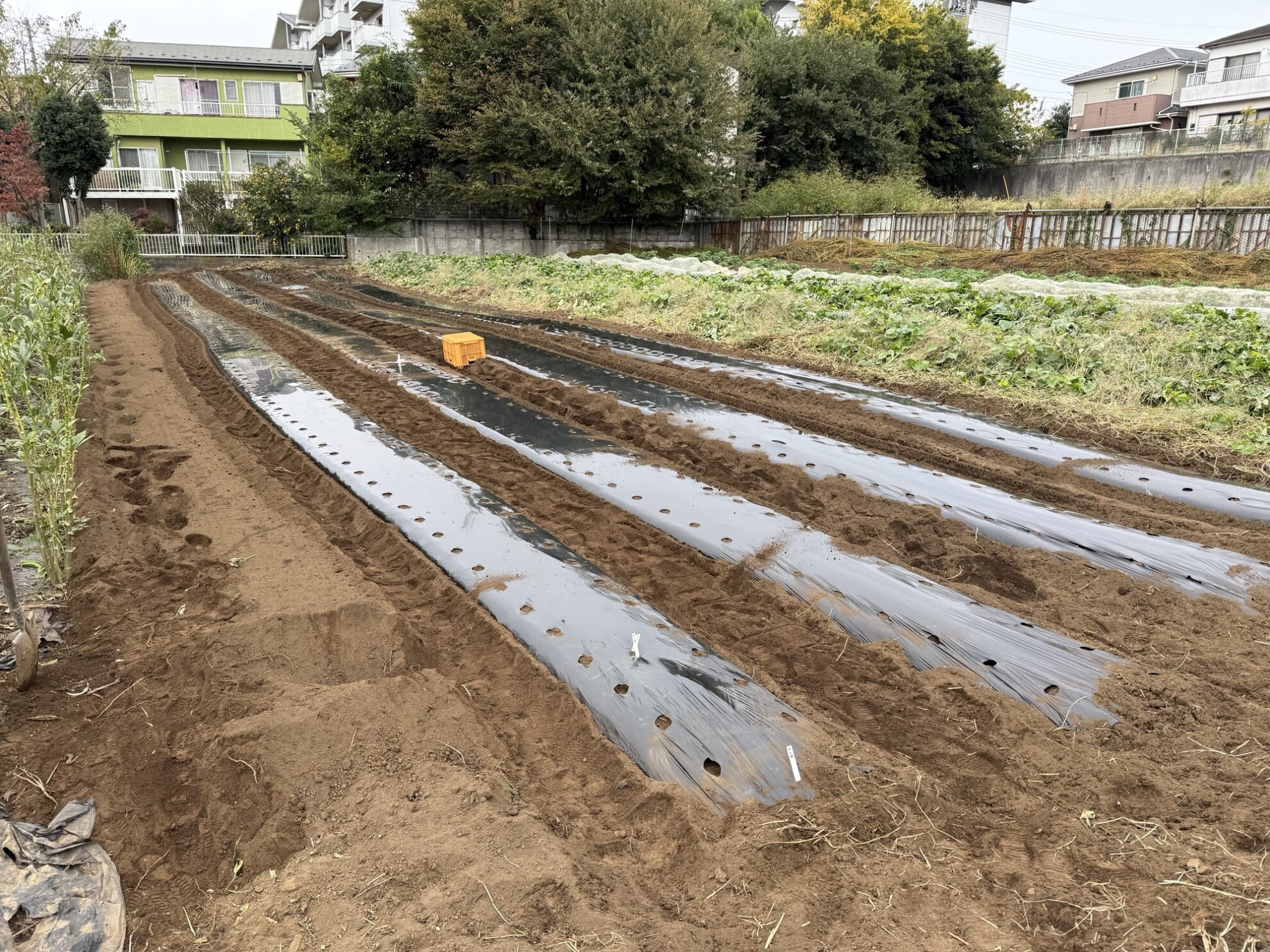 2025年10月31日(金)の作業記録 (斉藤さんの上の畑に大根用のマルチ張り作業、青首大根・強力大根の播種作業、吉岡さん畑の山部分で嘉定ニンニク・分葱の定植作業、ピーマンとモロヘイヤの撤去作業、吉岡さん畑でほうれん草の播種作業)