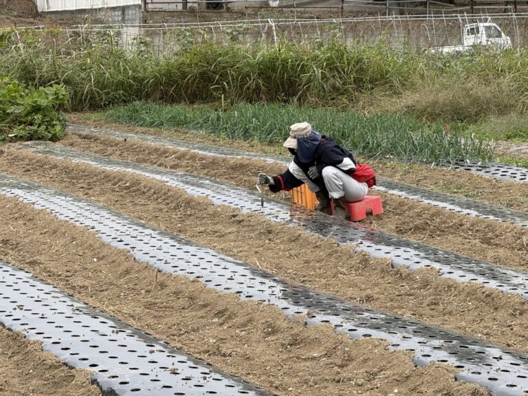 2025年10月31日(金)の作業記録 (斉藤さんの上の畑に大根用のマルチ張り作業、青首大根・強力大根の播種作業、吉岡さん畑の山部分で嘉定ニンニク・分葱の定植作業、ピーマンとモロヘイヤの撤去作業、吉岡さん畑でほうれん草の播種作業)