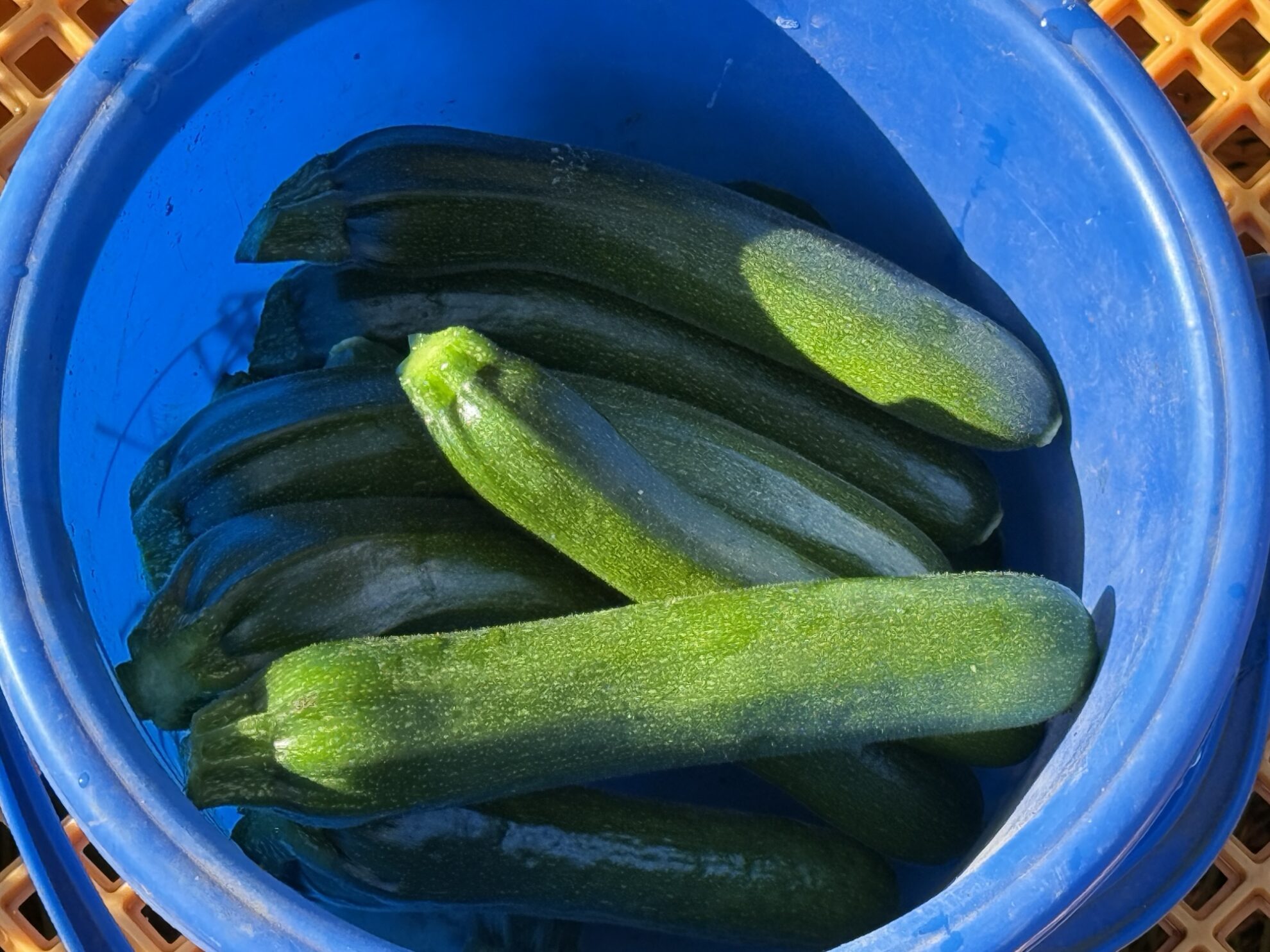 鈴木さん畑のビニールハウス内で、秋取りズッキーニの収穫作業。