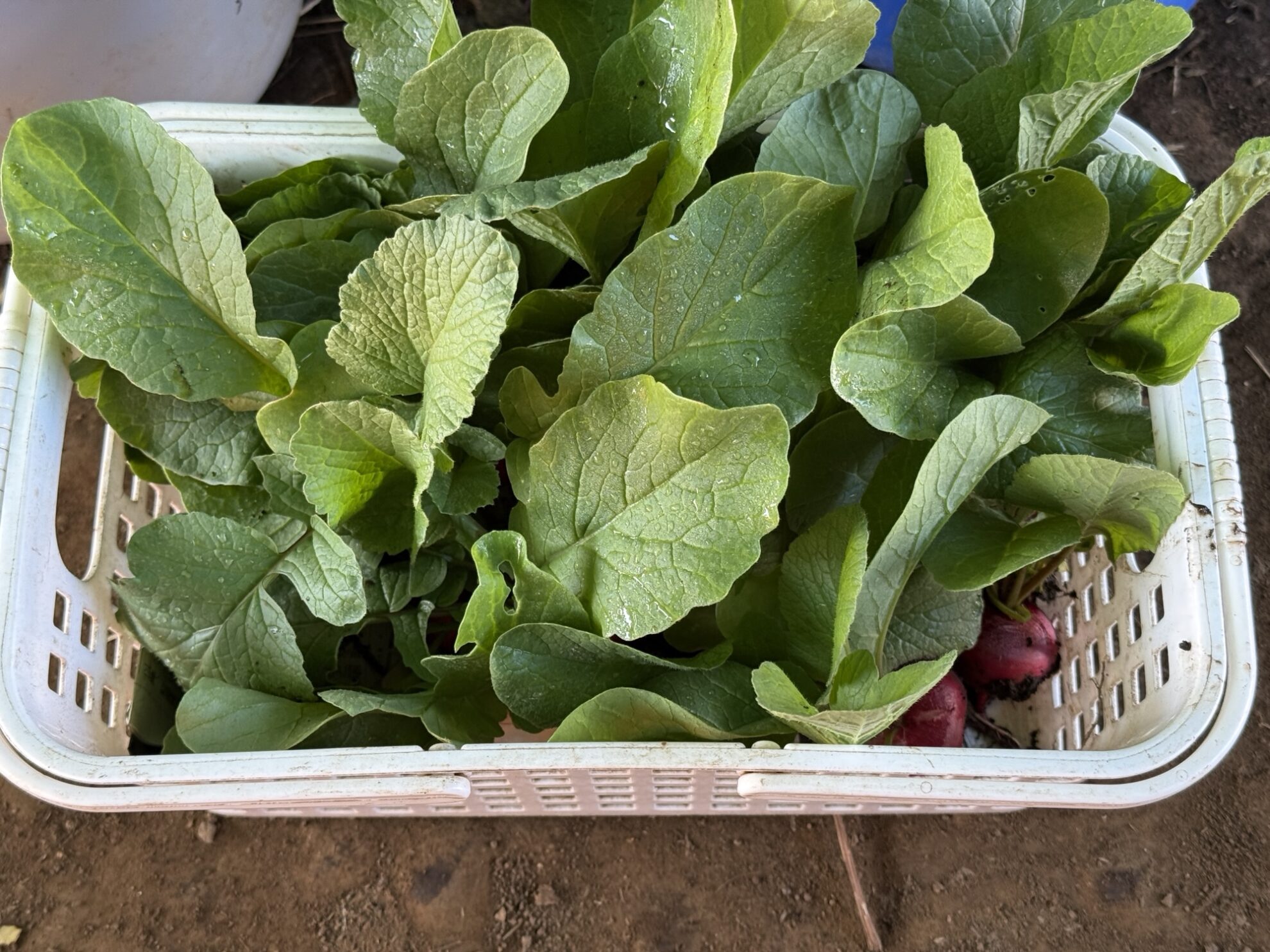 斉藤さんの上の畑で、ツルムラサキ、二十日大根の収穫。