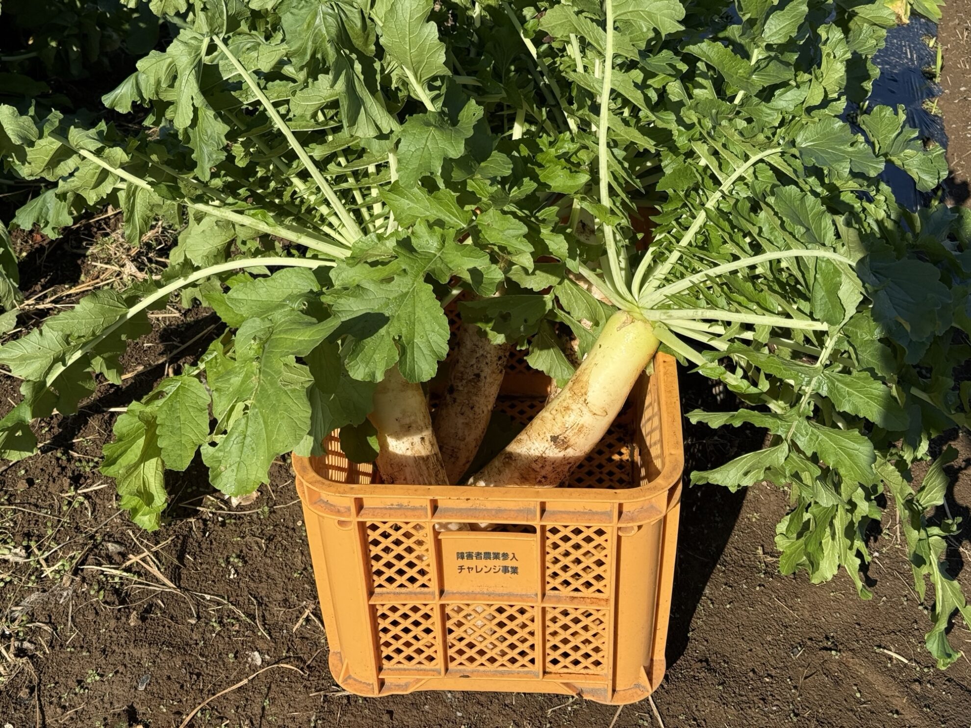 吉岡さん畑で、青首大根の収穫作業。
