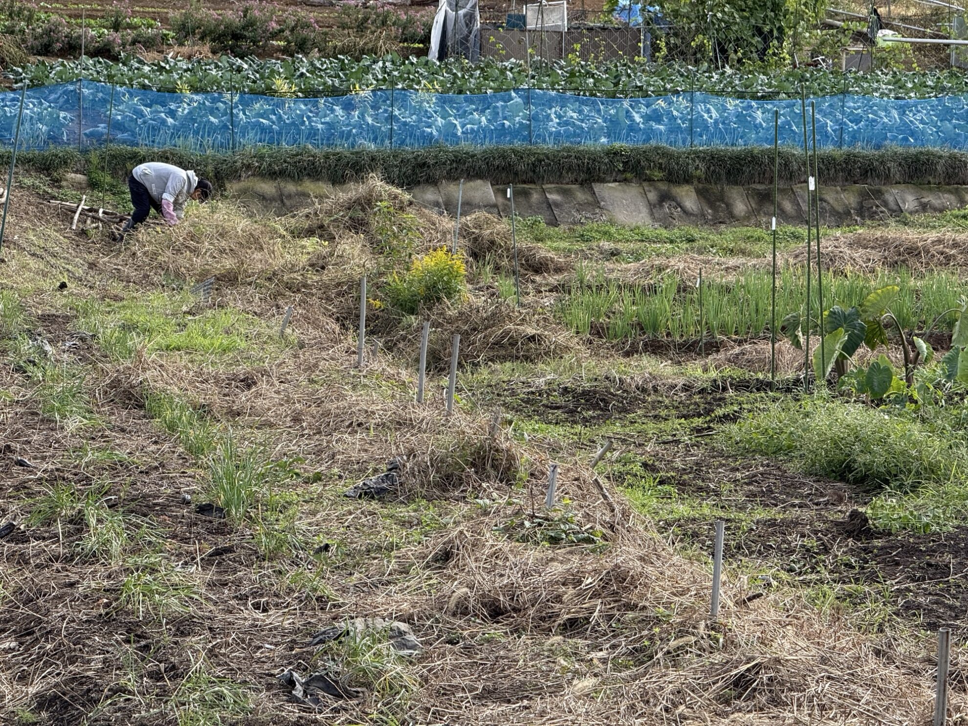 吉岡さん畑で嘉定ニンニク周りの除草作業。