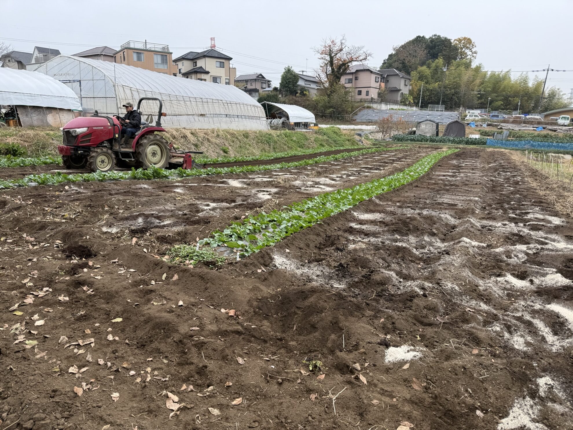 斉藤さんの中の畑の秋スペースに、牛糞堆肥、有機石灰を撒いてからトラクターで耕耘作業。