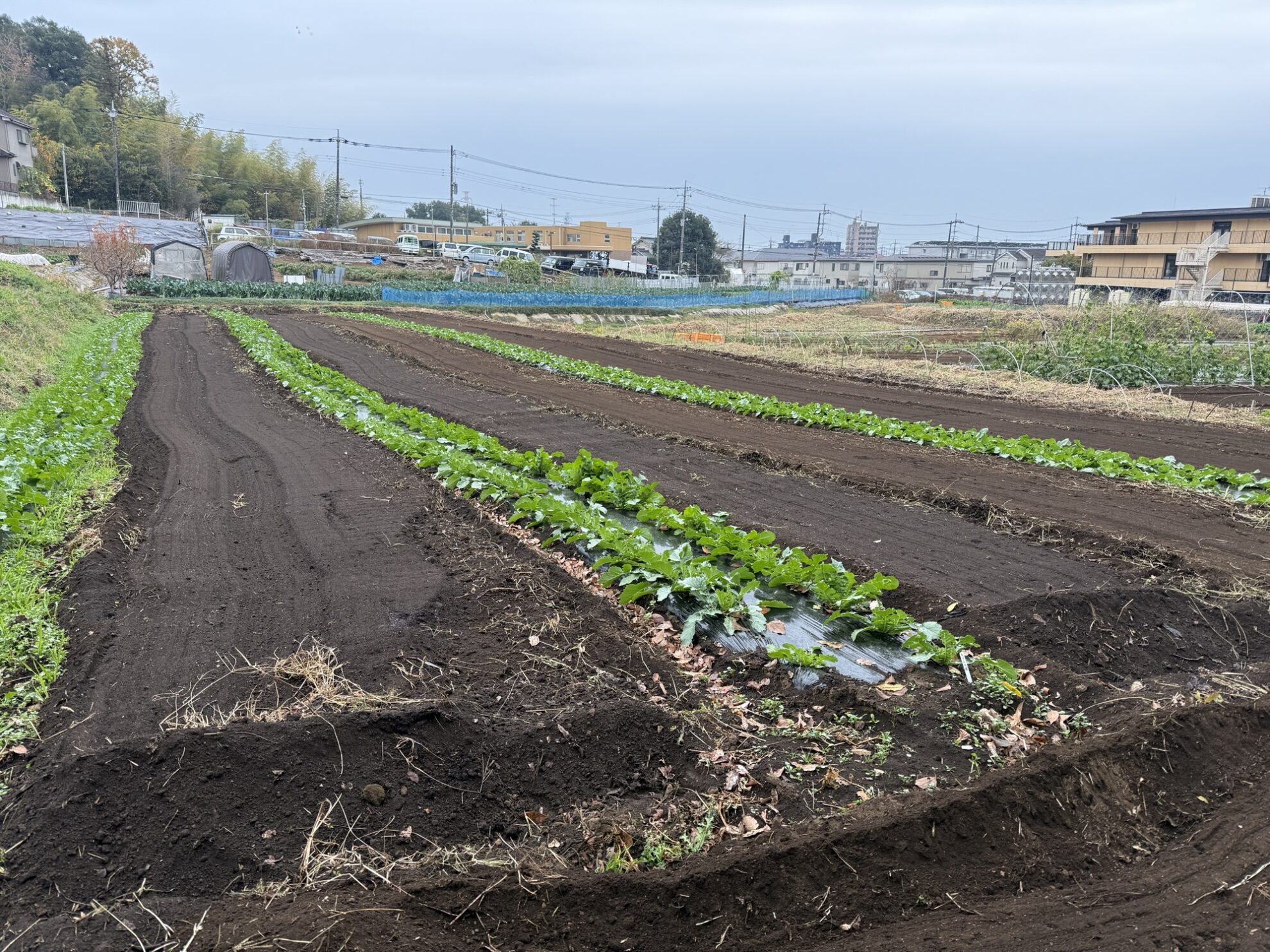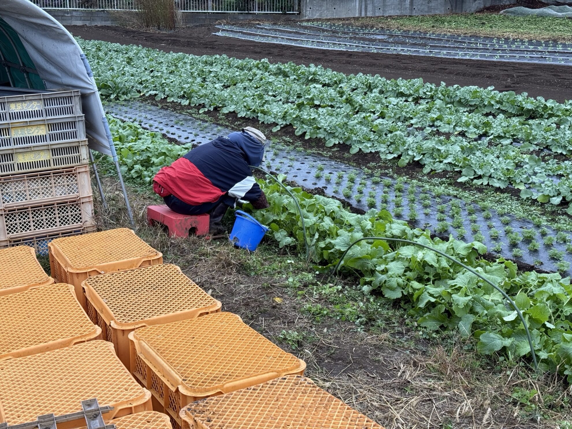 斉藤さんの上の畑で、二十日大根、小松菜の収穫作業。