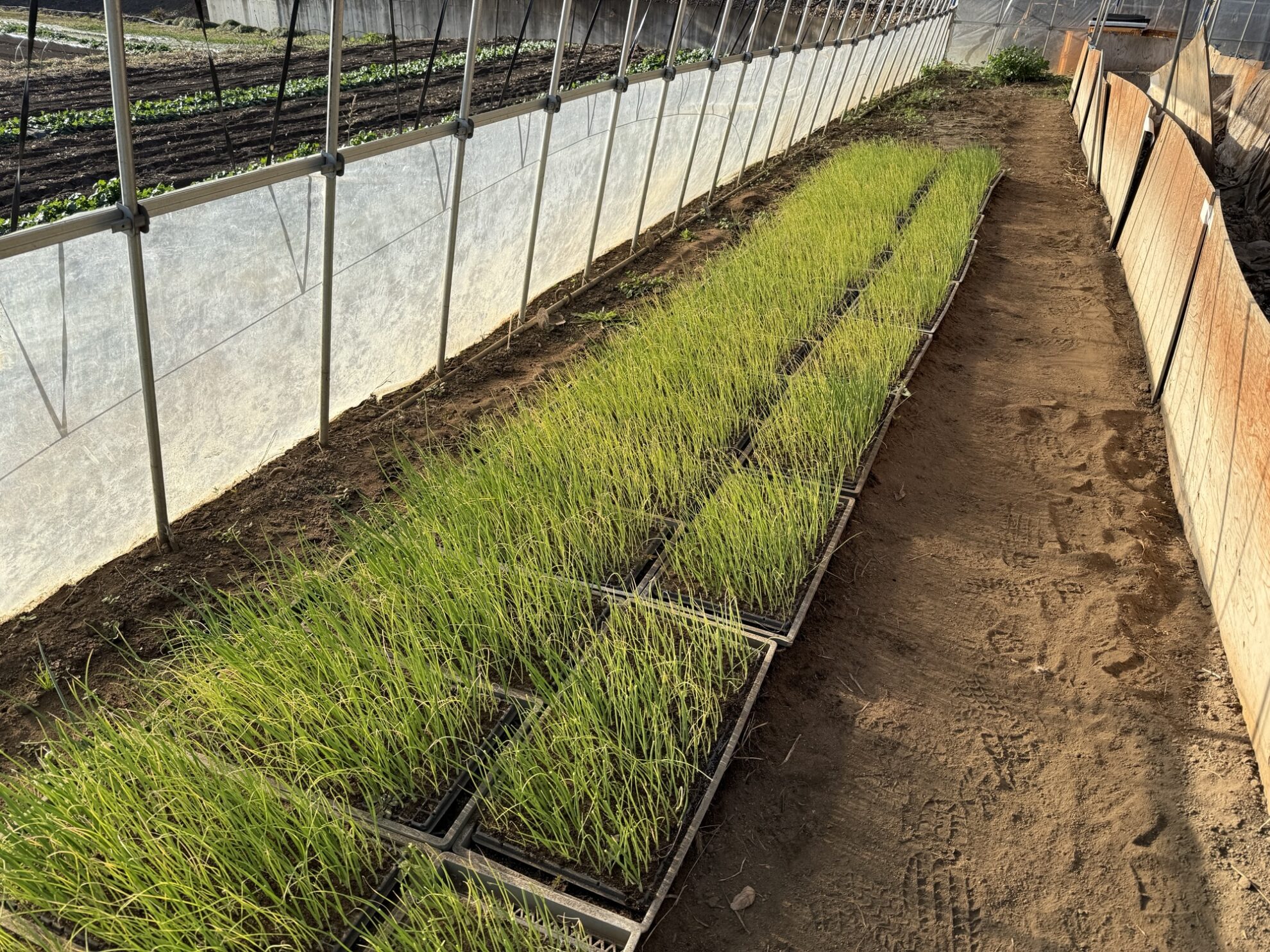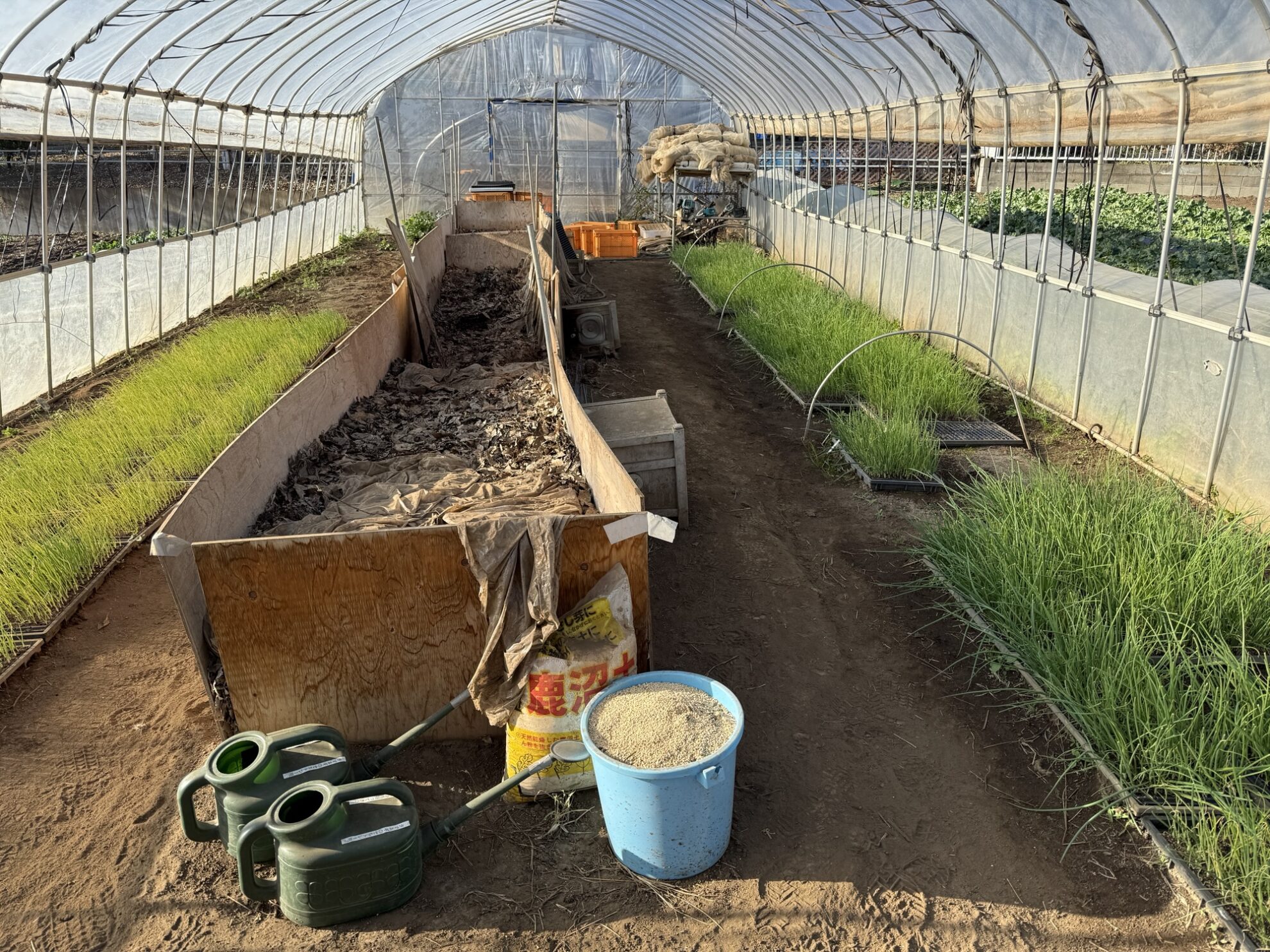 斉藤さん畑のビニールハウス内で、玉ねぎの苗に水やり作業。