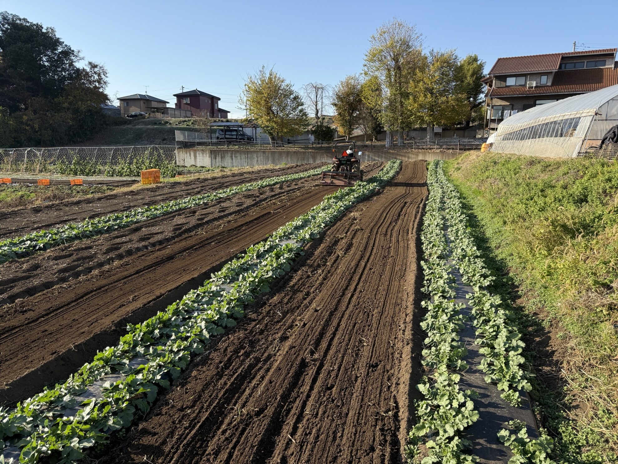 斉藤さんの中の畑の空きスペースに鶏糞を撒いて、トラクターで耕耘作業。