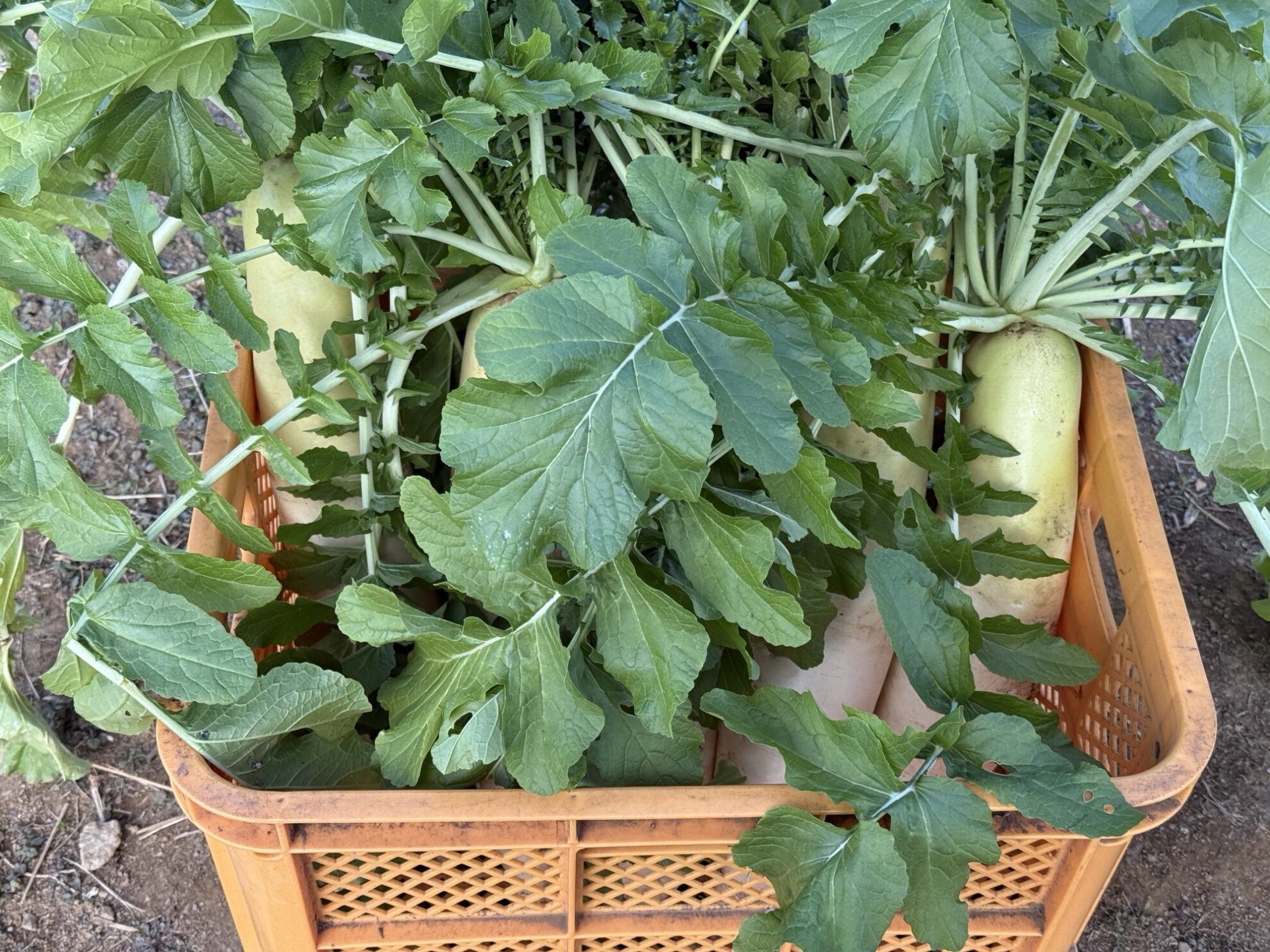 吉岡さん畑で、青首大根、葉玉ねぎの収穫作業。