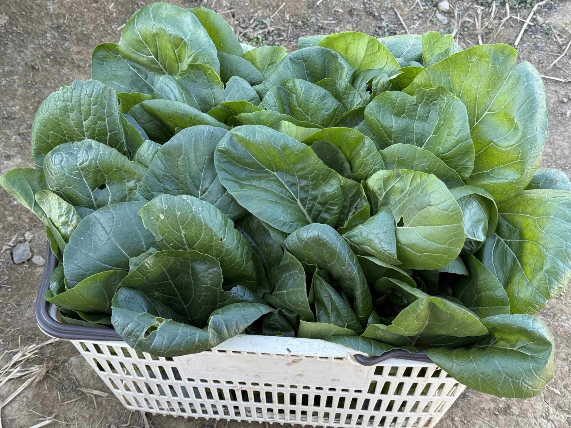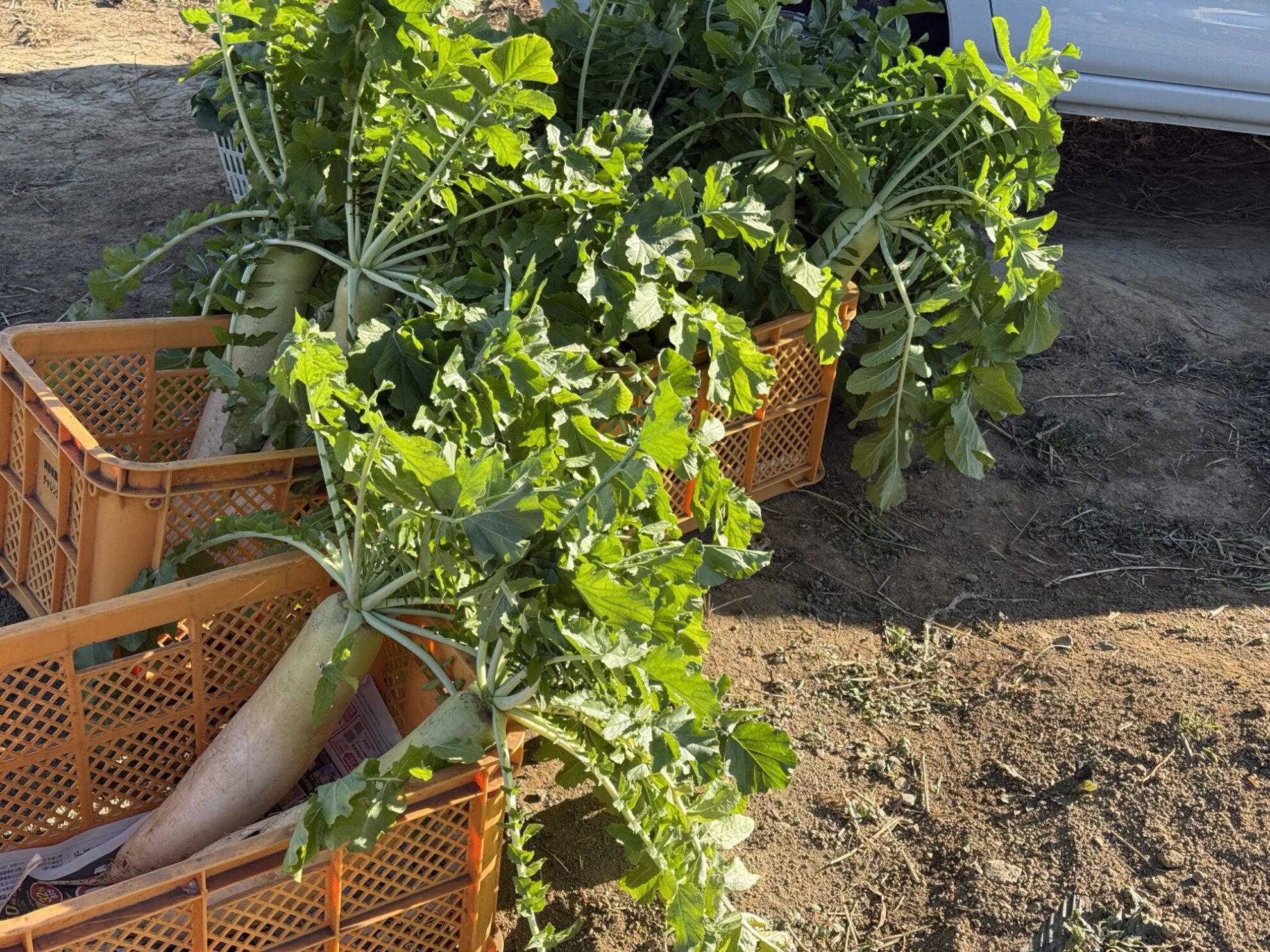 斉藤さんの上の畑で、小松菜、赤大根、小太り大根、パクチーの収穫作業。