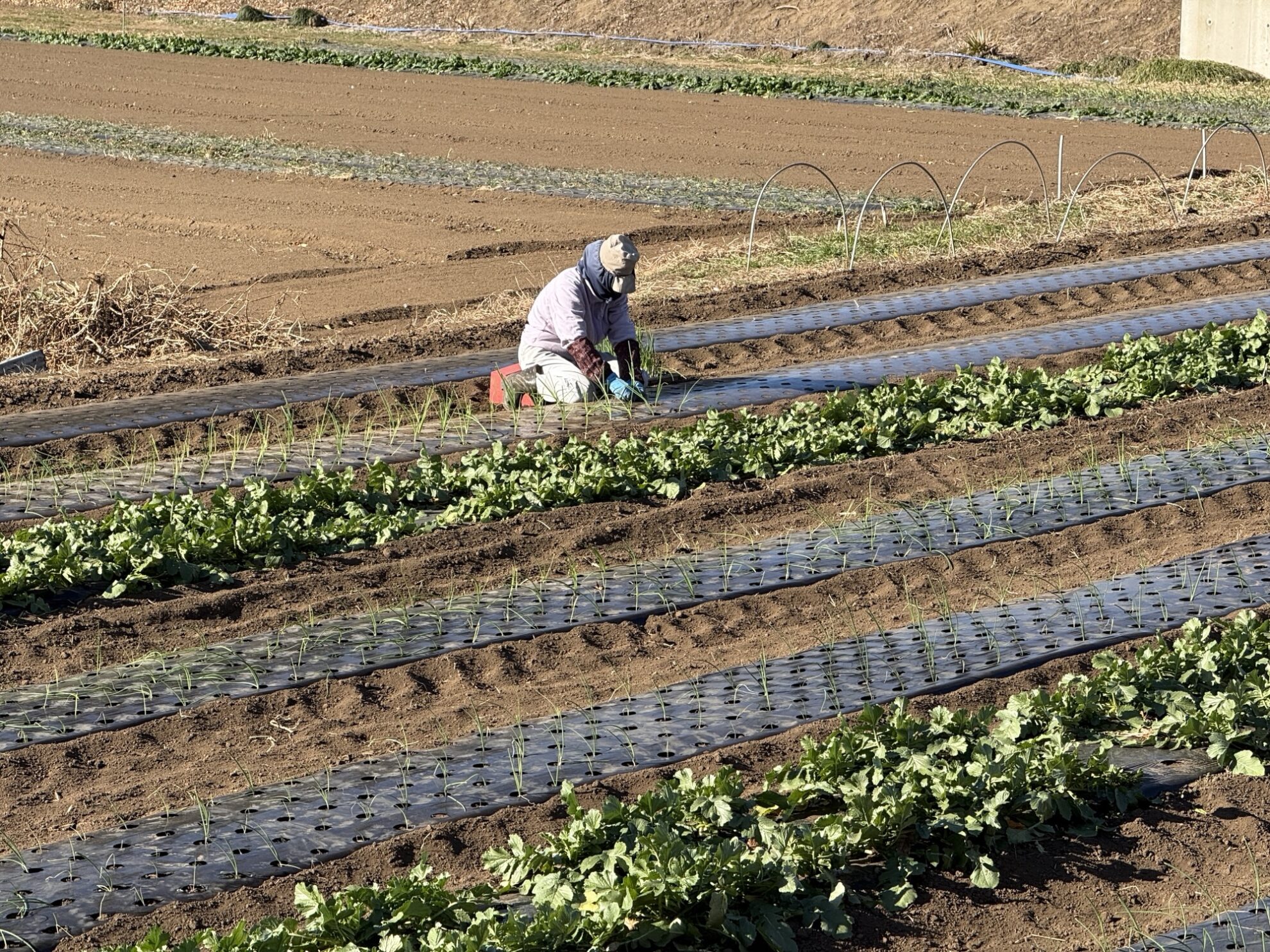 斉藤さんの中の畑で、間引きおでん大根の収穫作業。