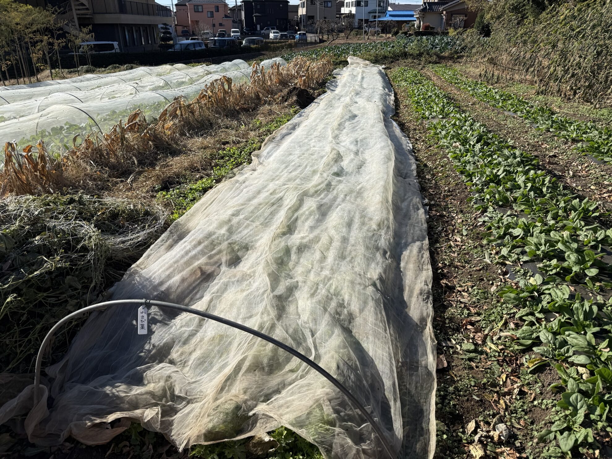 田中さんの上の畑で、春菊の防寒対策用に不織布と防虫ネット掛け作業。