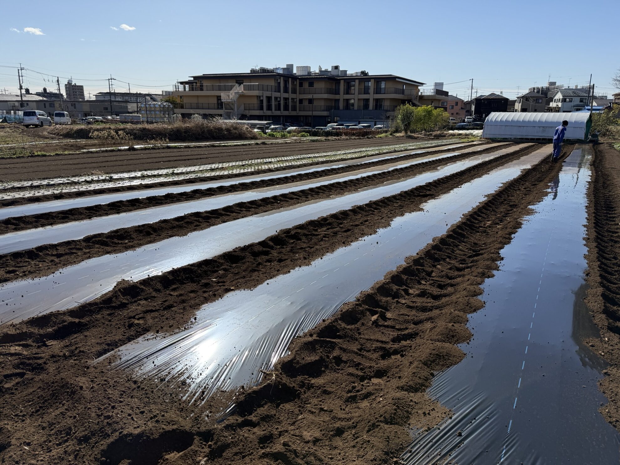 斉藤さんの下の畑で、玉ねぎ用にマルチ張り作業。