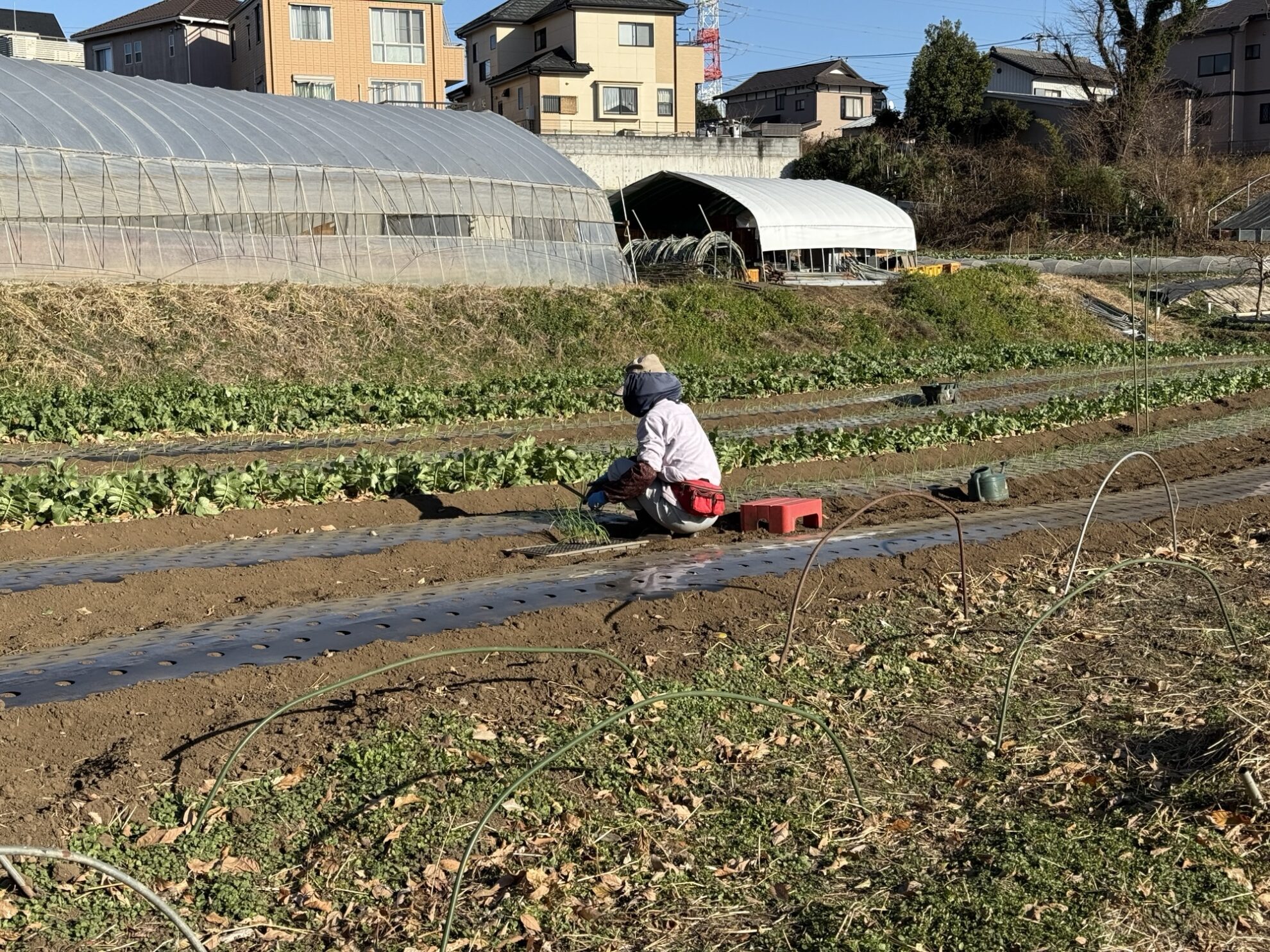 斉藤さんの下の畑で、ほうれん草の収穫作業。田中さんの上の畑で、春菊の収穫作業。