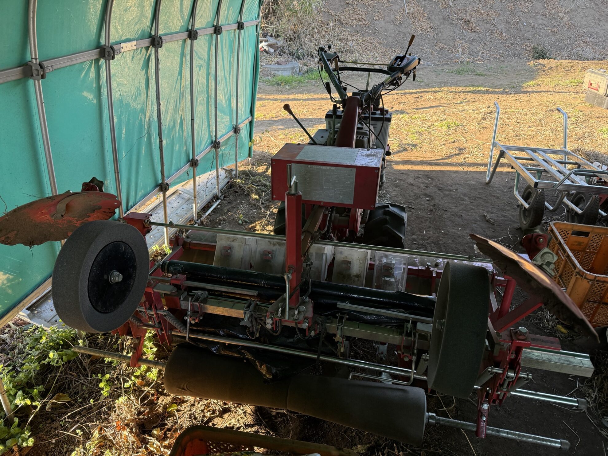 斉藤さんの下の畑で、マルチシーダーのマルチ設定幅の変更作業。