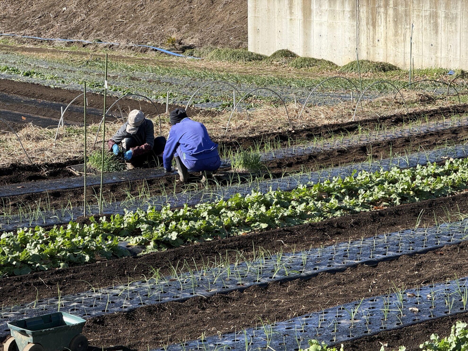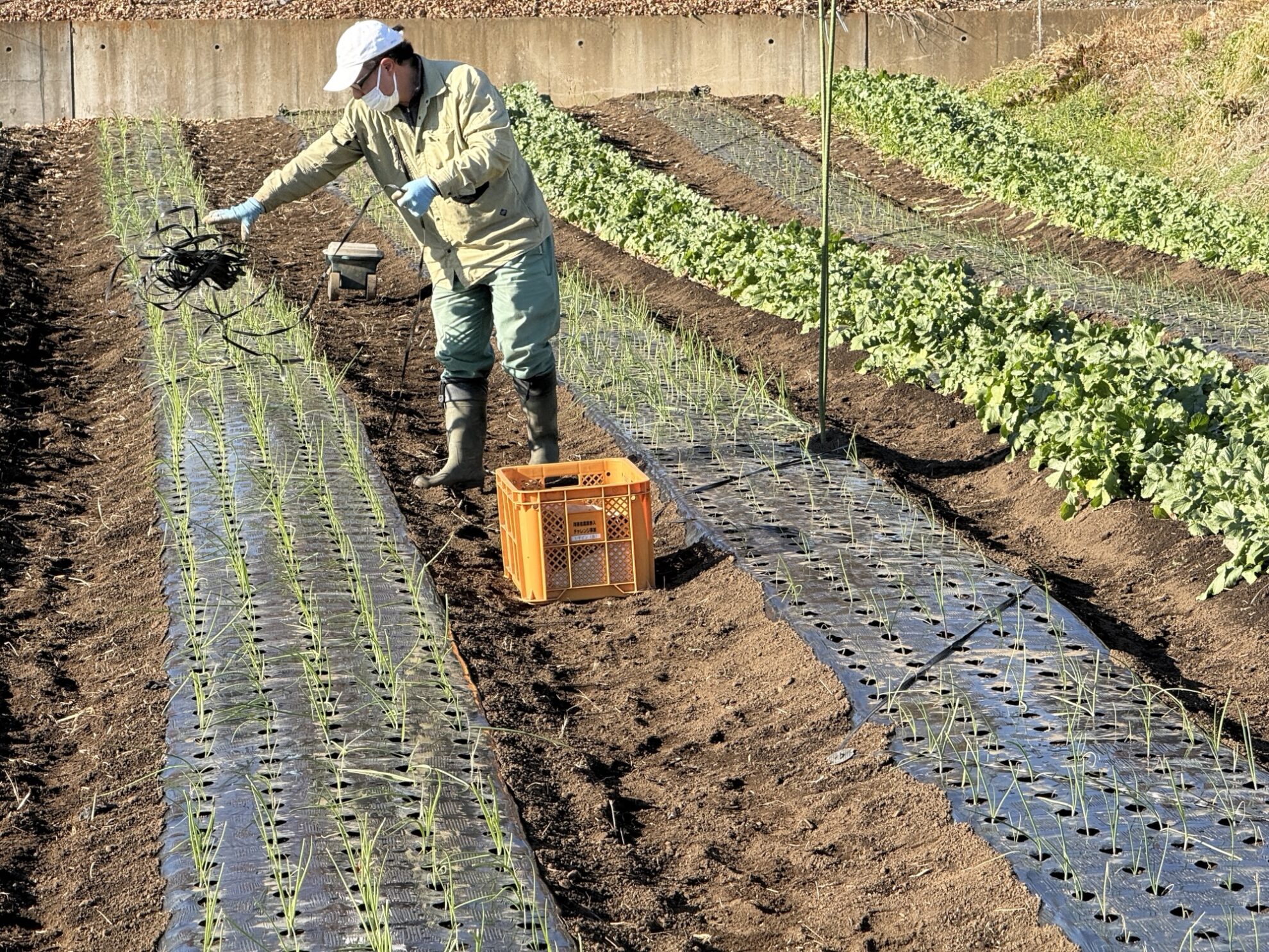 斉藤さんの中の畑で、玉ねぎ類のマルチに風剥がれ防止用にハウスバンド張り作業。