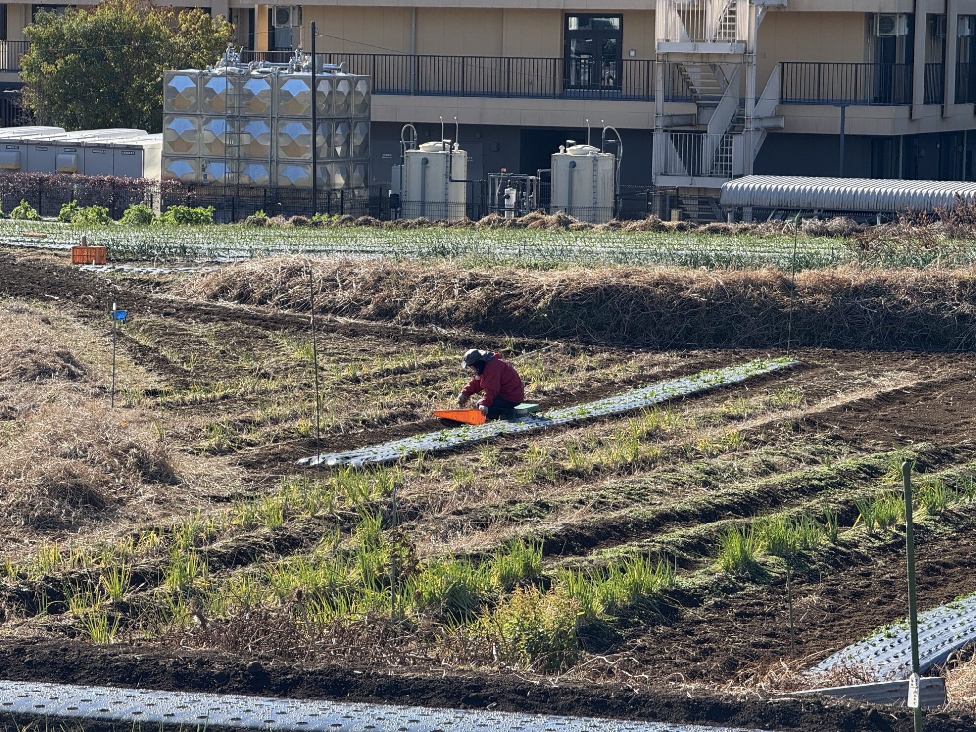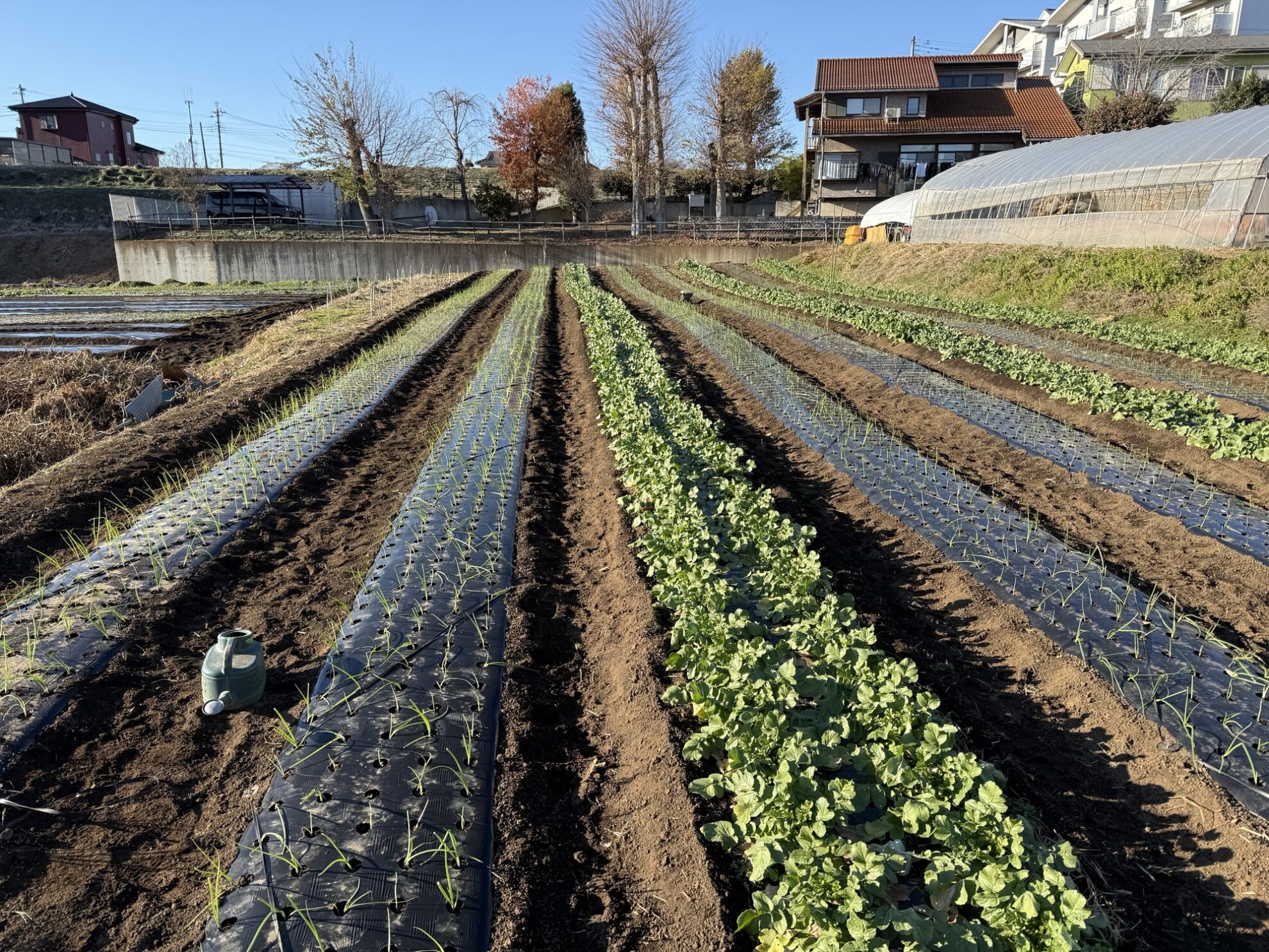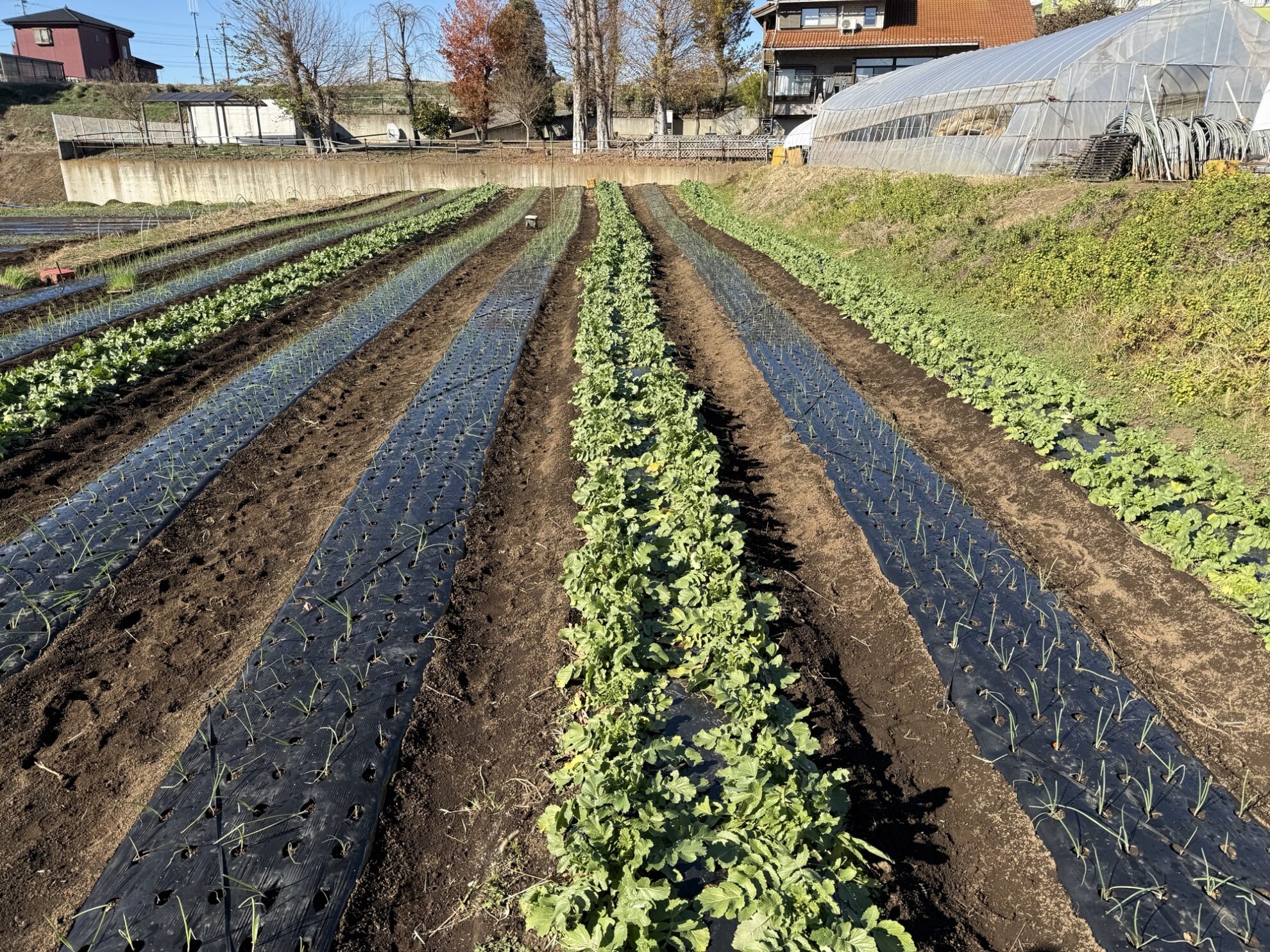 2025年12月15日(月)の作業記録 (赤玉ねぎの定植作業、玉ねぎ類のマルチの風対策用にハウスバンド張り作業)
