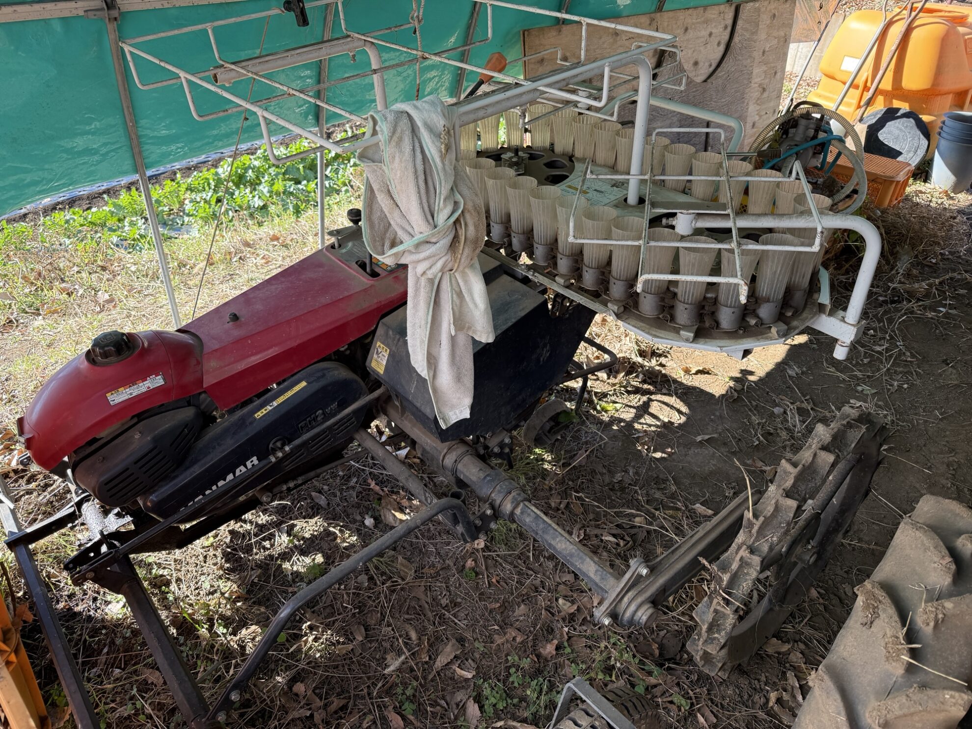 斉藤さんの上の畑の農機具置き場で、玉ねぎの移植機の始動チェック作業。