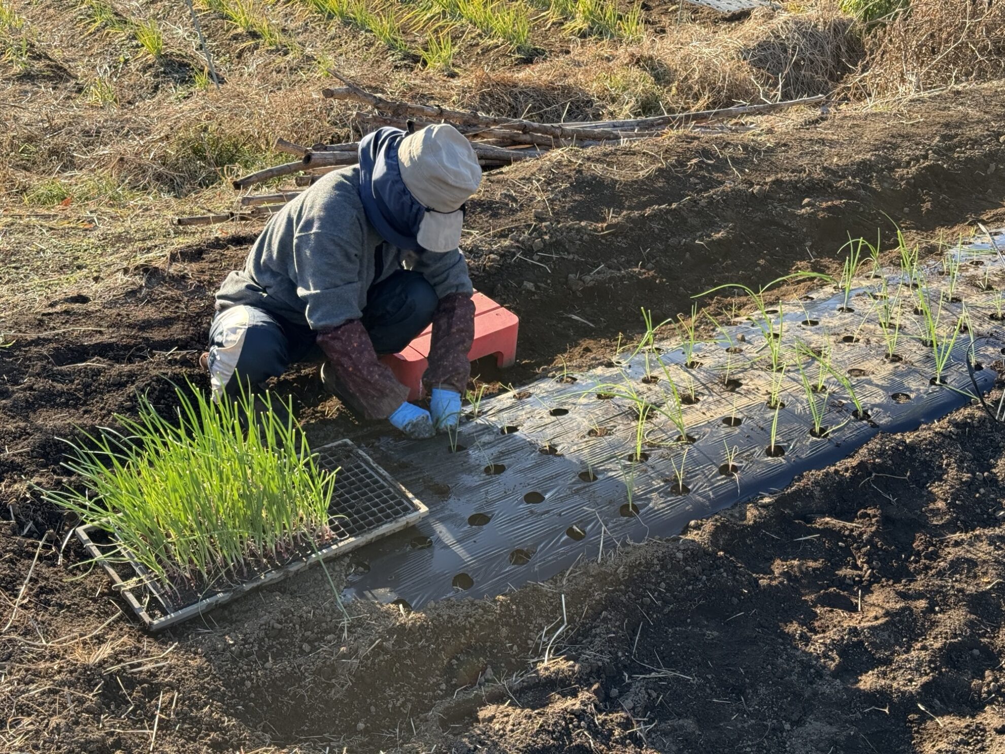 斉藤さんの中の畑で、赤玉ねぎの定植作業。