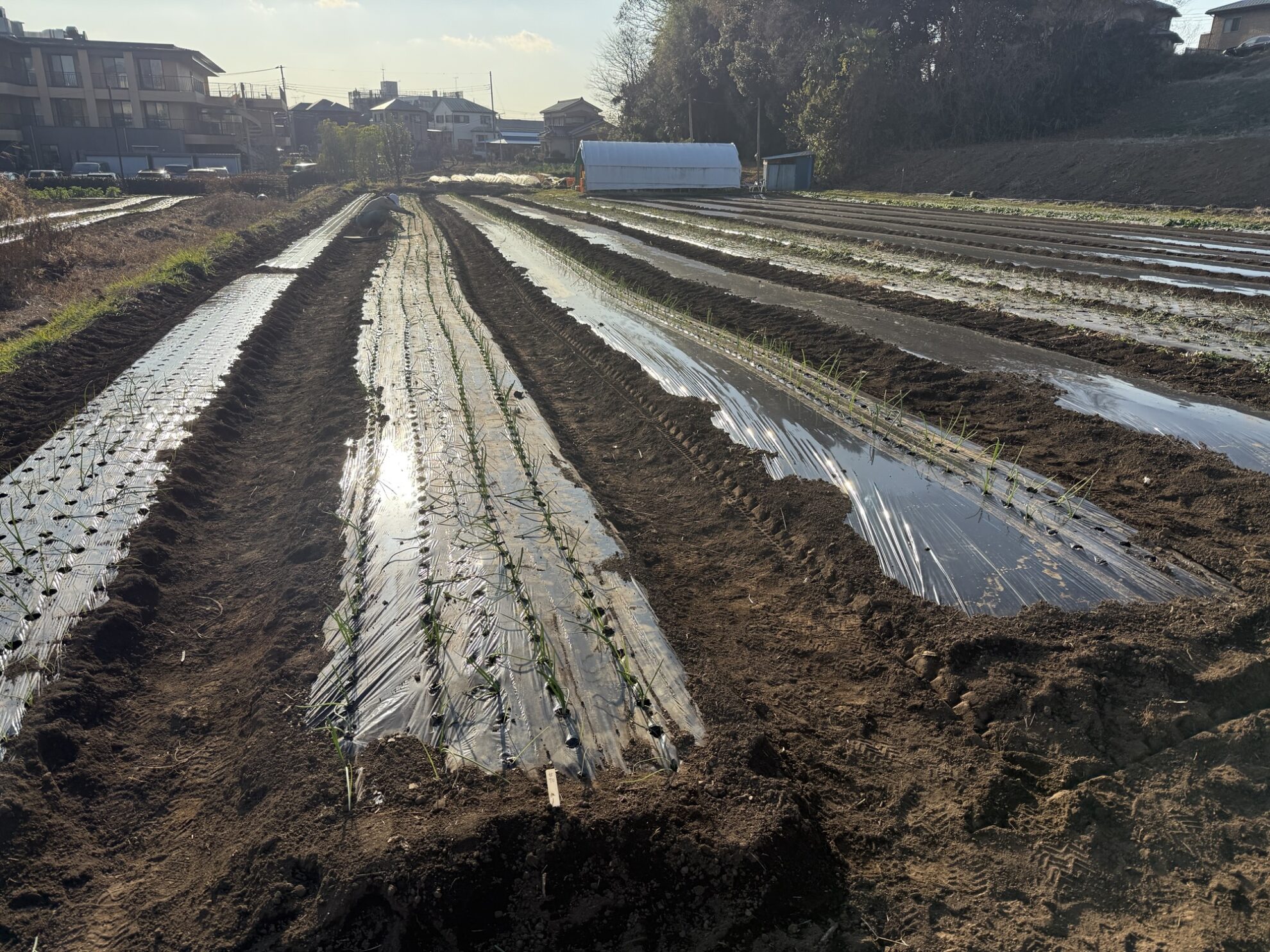 斉藤さんの下の畑で、玉ねぎ(甘70)の定植補植作業。