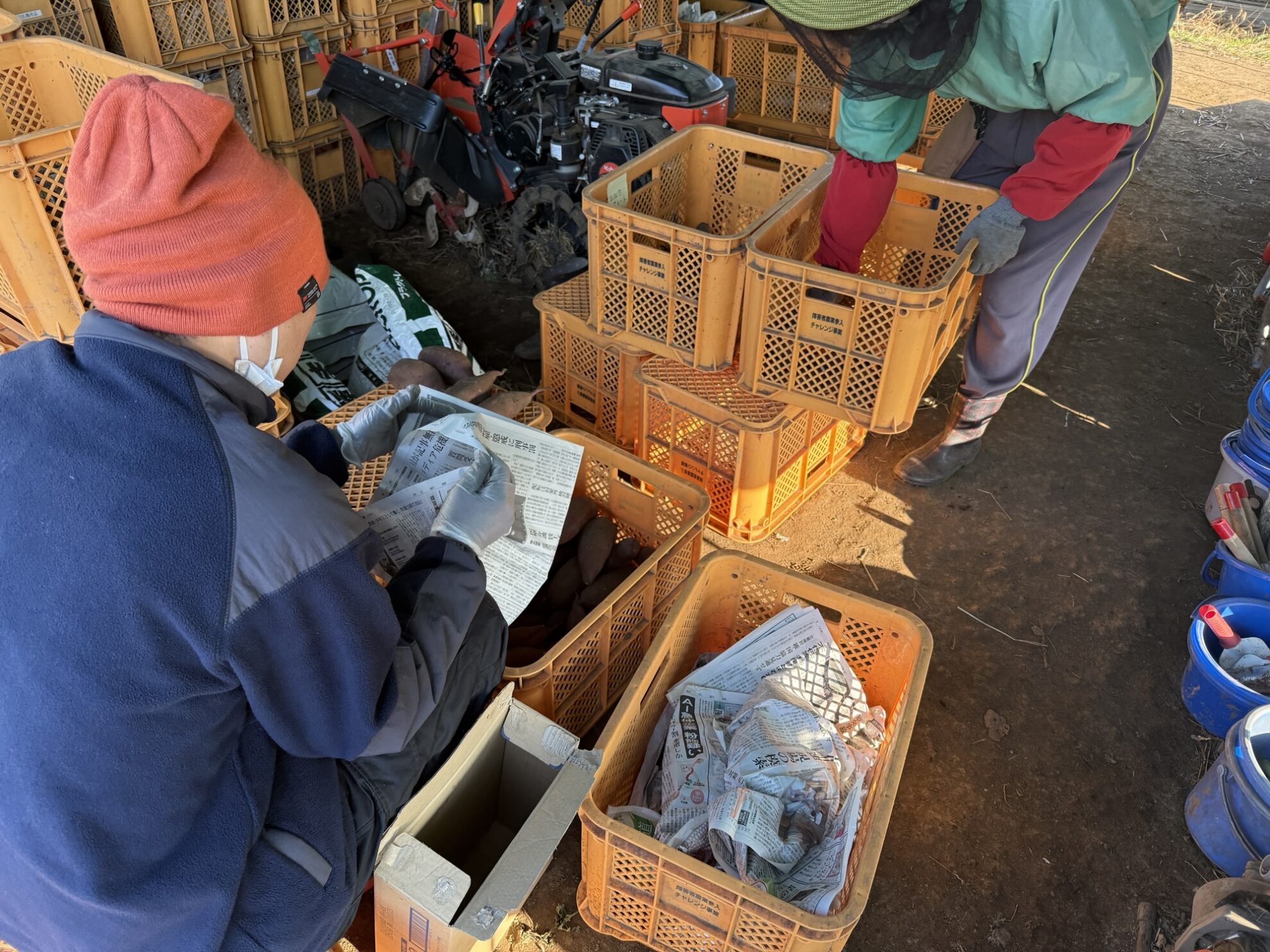 斉藤さんの上の休憩所で、サツマイモの保管の為にサツマイモを新聞で包む作業とセルトレイの土落とし作業。