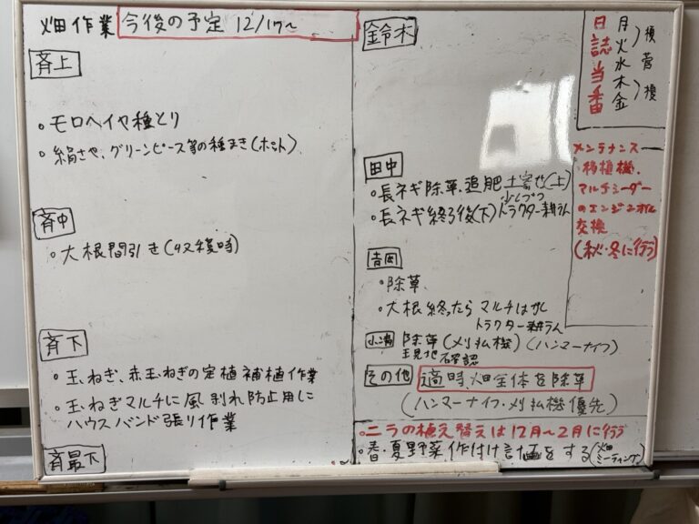 本日の畑作業は午後のみで、午前中は、畑の作付け図面作り、今後の作業予定をホワイトボードに書き出す作業を行いました。