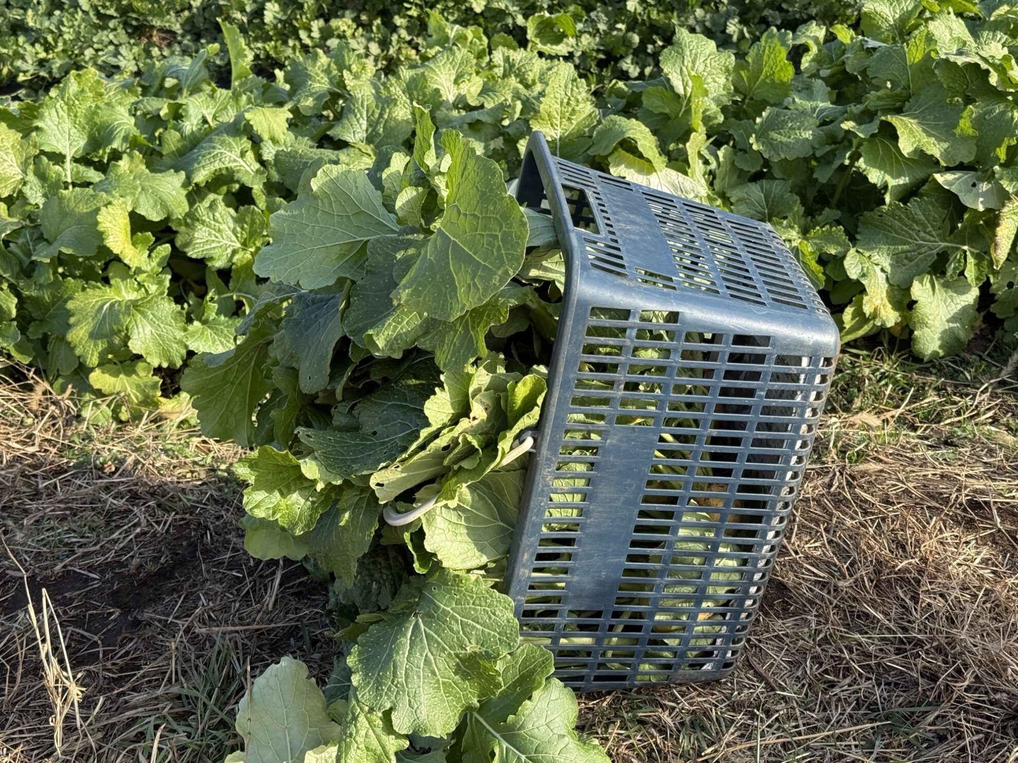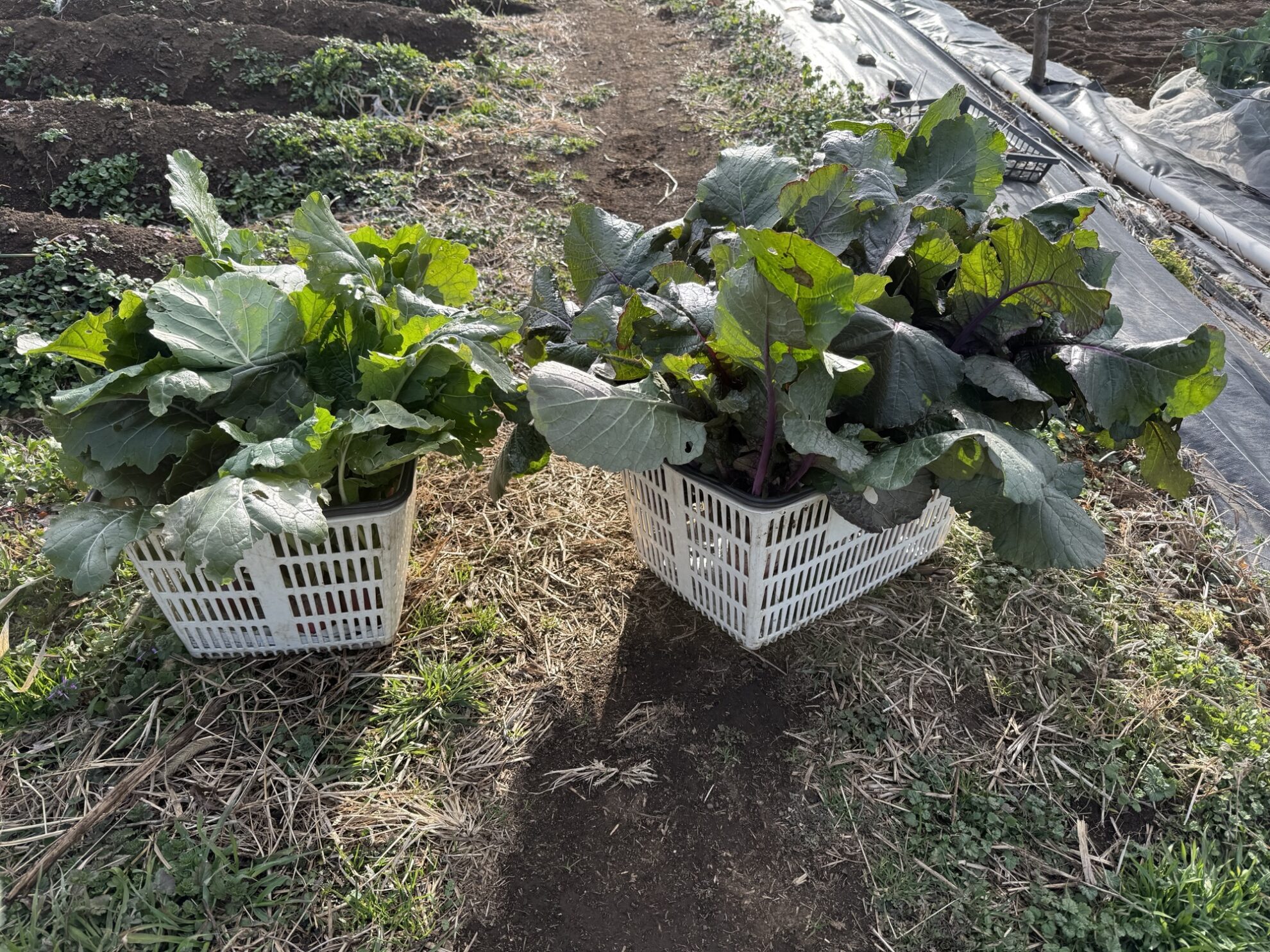 田中さんの上の畑で、春菊、赤カブ、カブ(味こがね)の収穫作業。